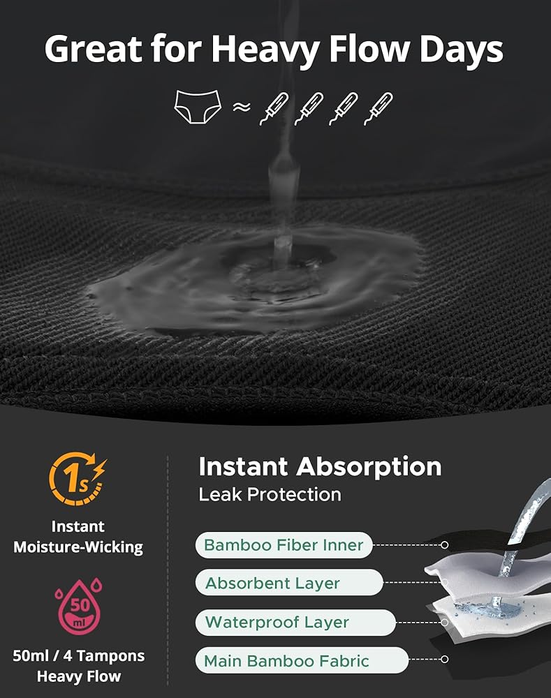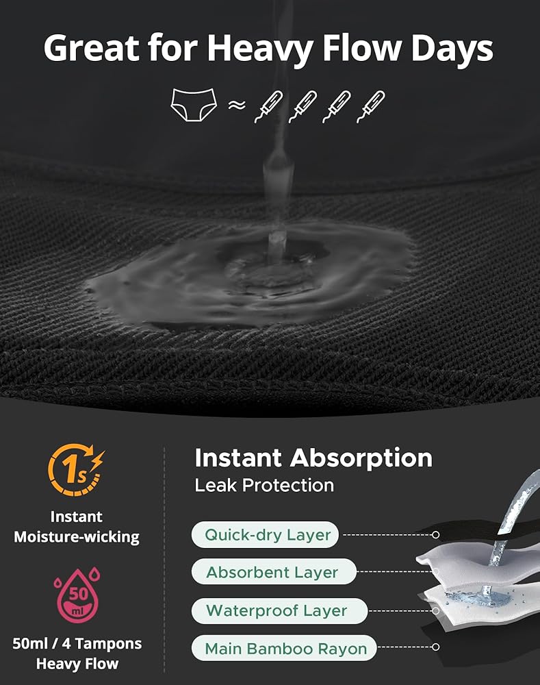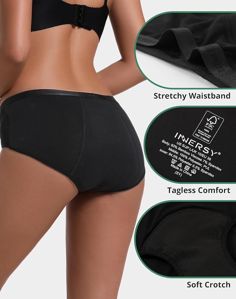 سراويل الحيض ذات التدفق الثقيل: تتميز الملابس الداخلية النسائية من INNERSY بتصميم ثلاثي الطبقات بين الرجلين يضمن امتصاص ما يصل إلى 50 مل من السائل. تم تصميم هذه الملابس الداخلية المقاومة للتسرب بحافة عزل مصنوعة خصيصًا حول بطانة الحوض، مما يمنع التسرب الجانبي بشكل فعال