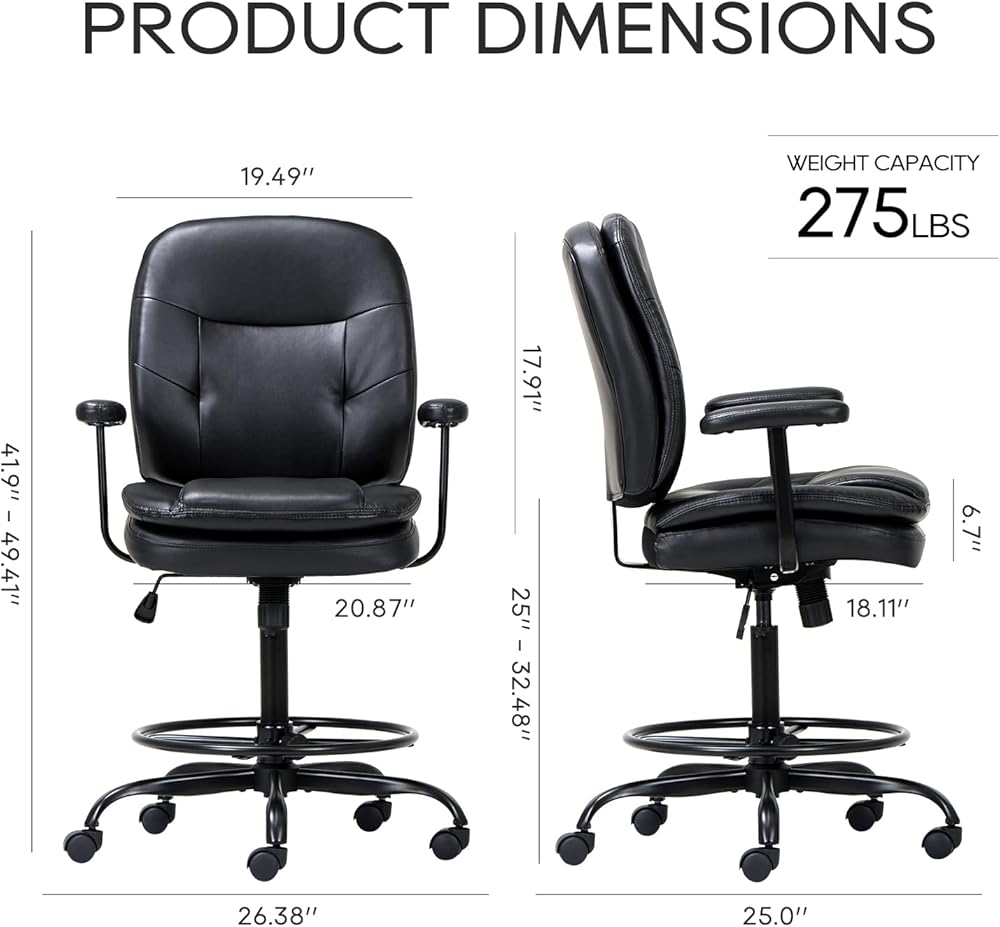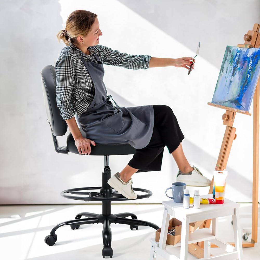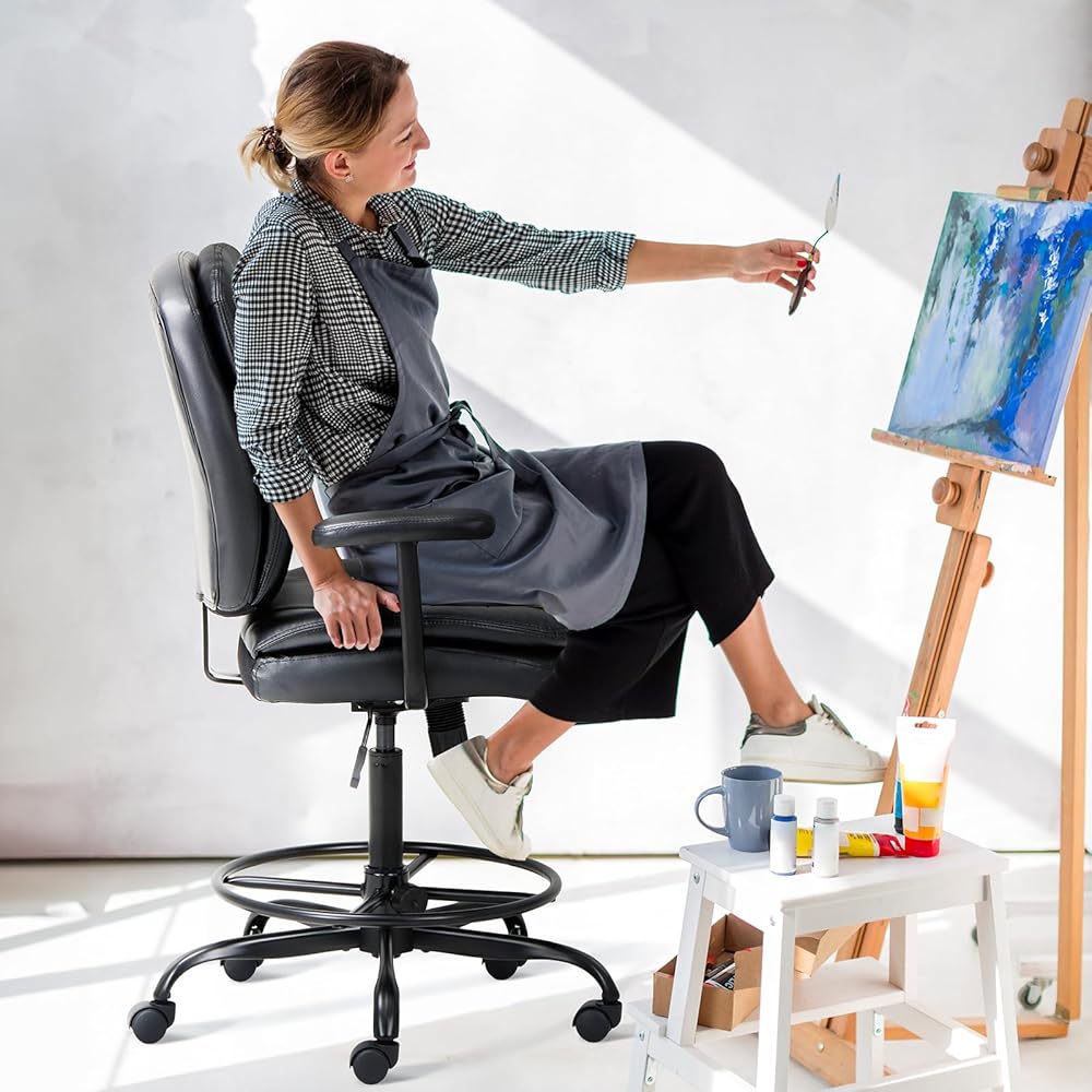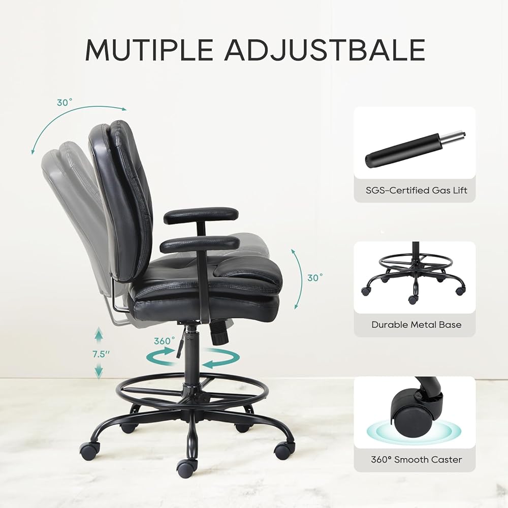 ارتفاع قابل للتعديل وحلقة مسند للقدمين: استمتع براحة لا مثيل لها مع كرسي المكتب العالي! يمكنك ضبط ارتفاع حلقة مسند القدم باستخدام المقبض، ويتكيف كرسي المكتب الطويل هذا بسهولة مع وضعي الوقوف والجلوس، مما يوفر دعمًا استثنائيًا ويخفف ضغط الساق لتعزيز كفاءة عملك.