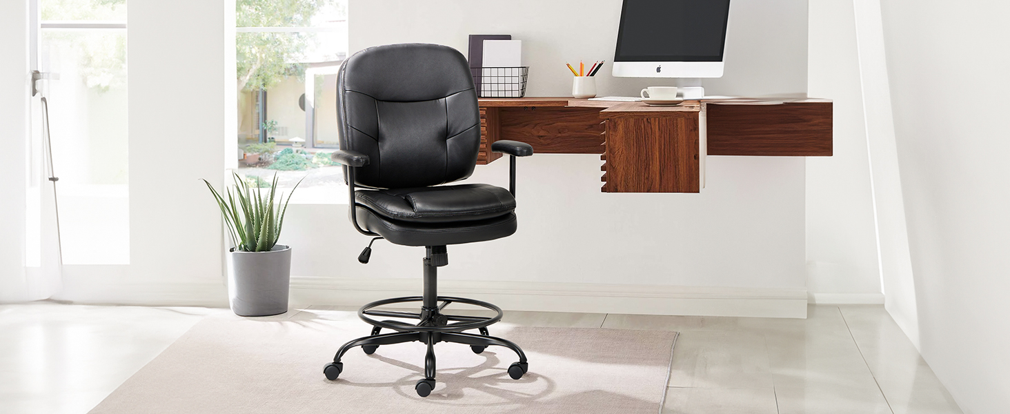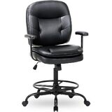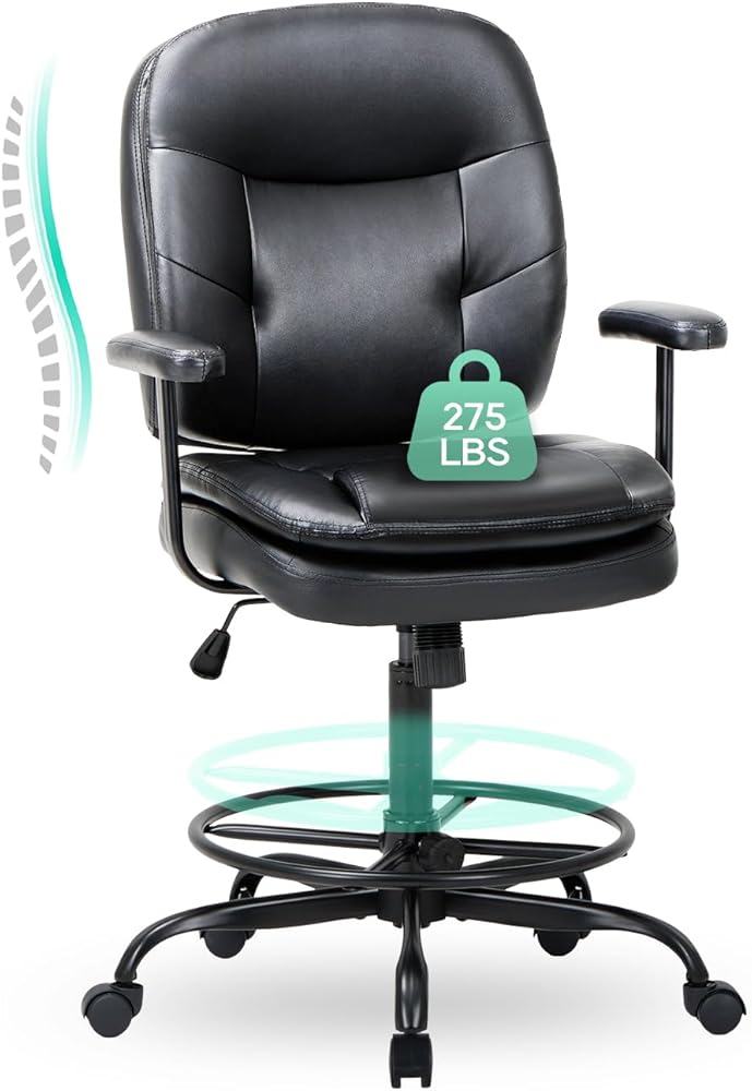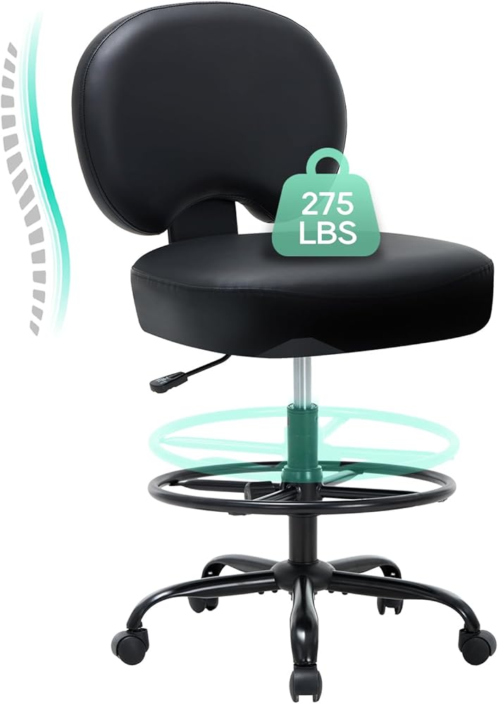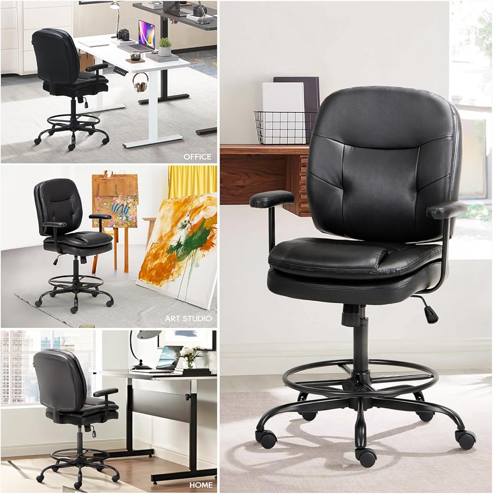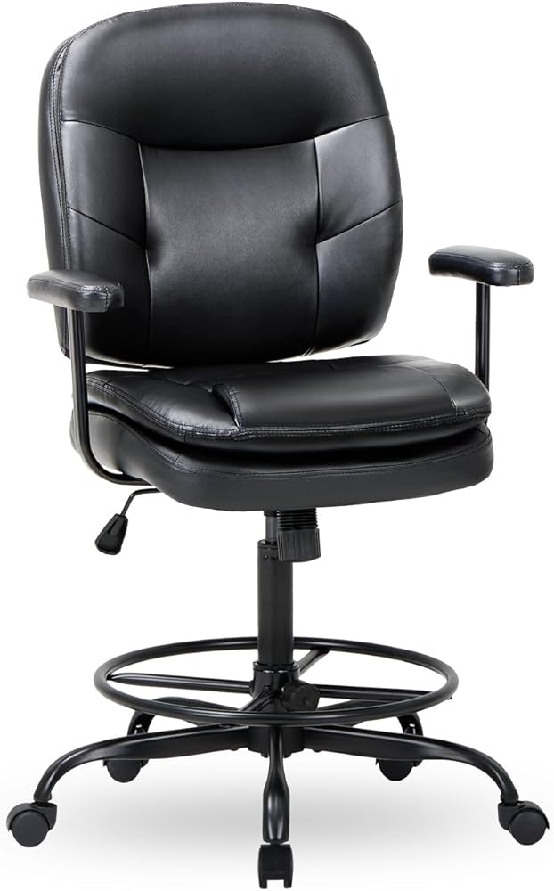 ارتفاع قابل للتعديل وحلقة مسند للقدمين: استمتع براحة لا مثيل لها مع كرسي المكتب العالي! يمكنك ضبط ارتفاع حلقة مسند القدم باستخدام المقبض، ويتكيف كرسي المكتب الطويل هذا بسهولة مع وضعي الوقوف والجلوس، مما يوفر دعمًا استثنائيًا ويخفف ضغط الساق لتعزيز كفاءة عملك.