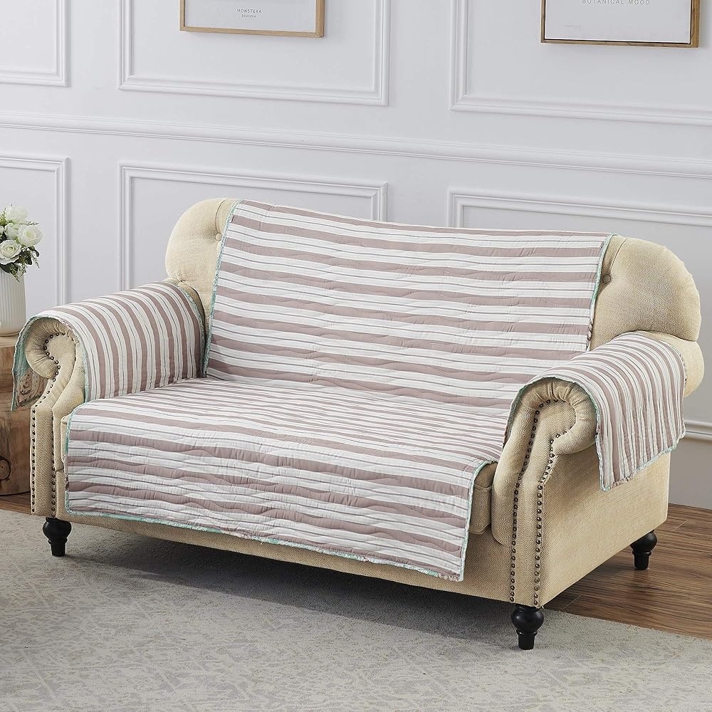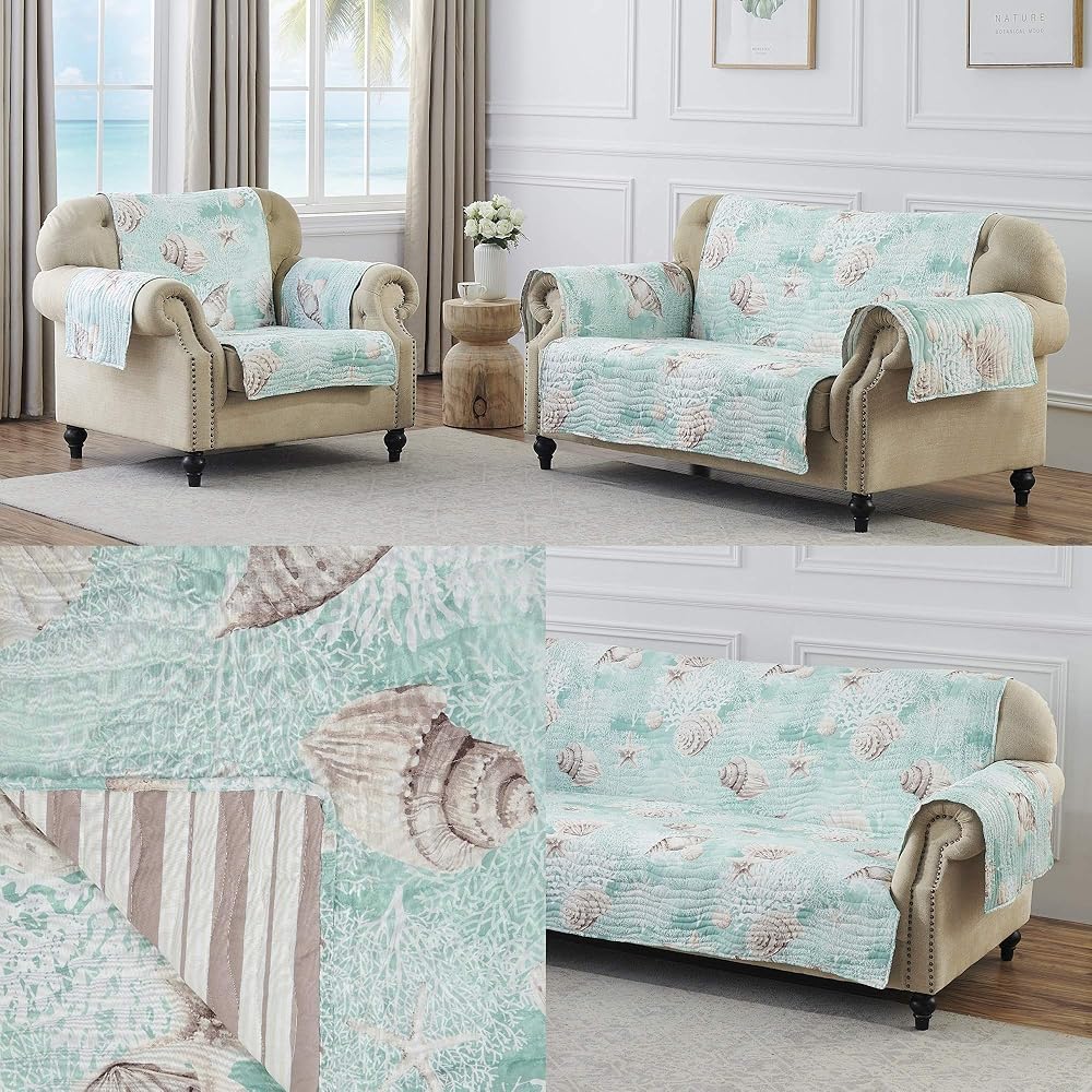 Bring the beach life into your home with the Ocean furniture cover by Barefoot Bungalow. Feel the sparkling waters of a sandy shore greet your feet in the colors of this calming slipcover protector. Featuring conch shells in a tranquil turquoise, cabana stripe reverse, and machine quilting throughout, Ocean provides an oasis of coastal comfort. Protect your furniture from spills, pet hair, paws, wear and tear with these generously-sized furniture protectors. Big enough to provide ample coverage on most home furniture. Reversible protector is printed in coordinating patterns on both sides for two looks in one and includes an elastic strap to hold protector in place on your furniture. Dimensions: Armchair Protector 81x81 inches; Loveseat Protector 103x76 inches; Sofa Protector 127 inches x 77 inches; all dimensions +/- 2 inches. 100% polyester. Machine washable.