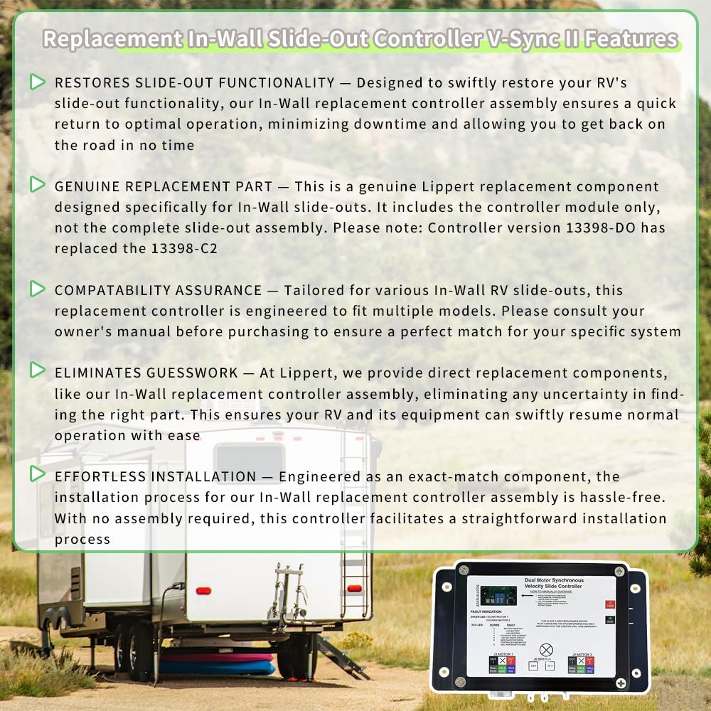 • ✅【Compatible】Replacement In-Wall Slide-Out Controller V-Sync II Features,This is a genuine Lippert replacement component designed specifically for In-Wall slide-outs. It includes the controller module only, not the complete slide-out assembly. Please note: Controller version 13398-DO has replaced the 13398-C2