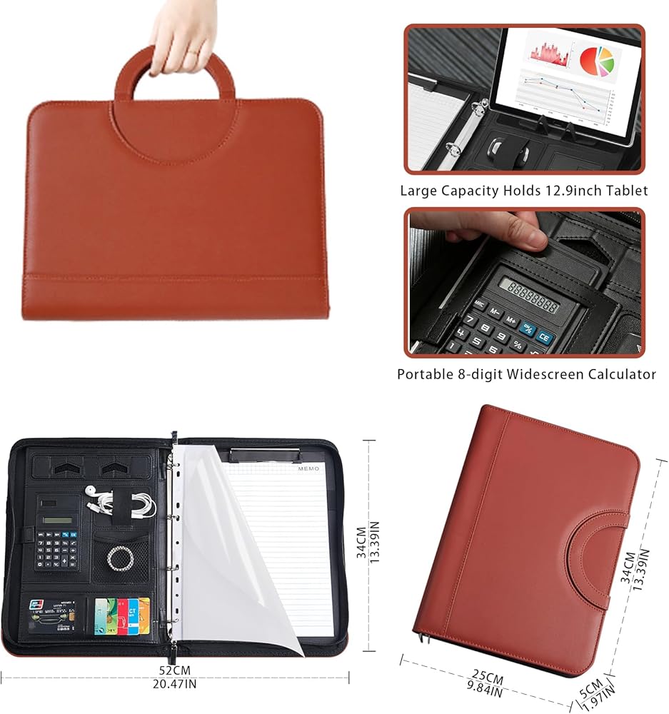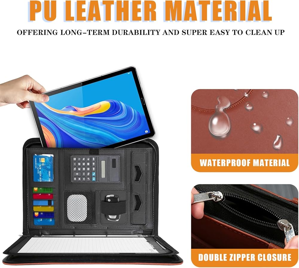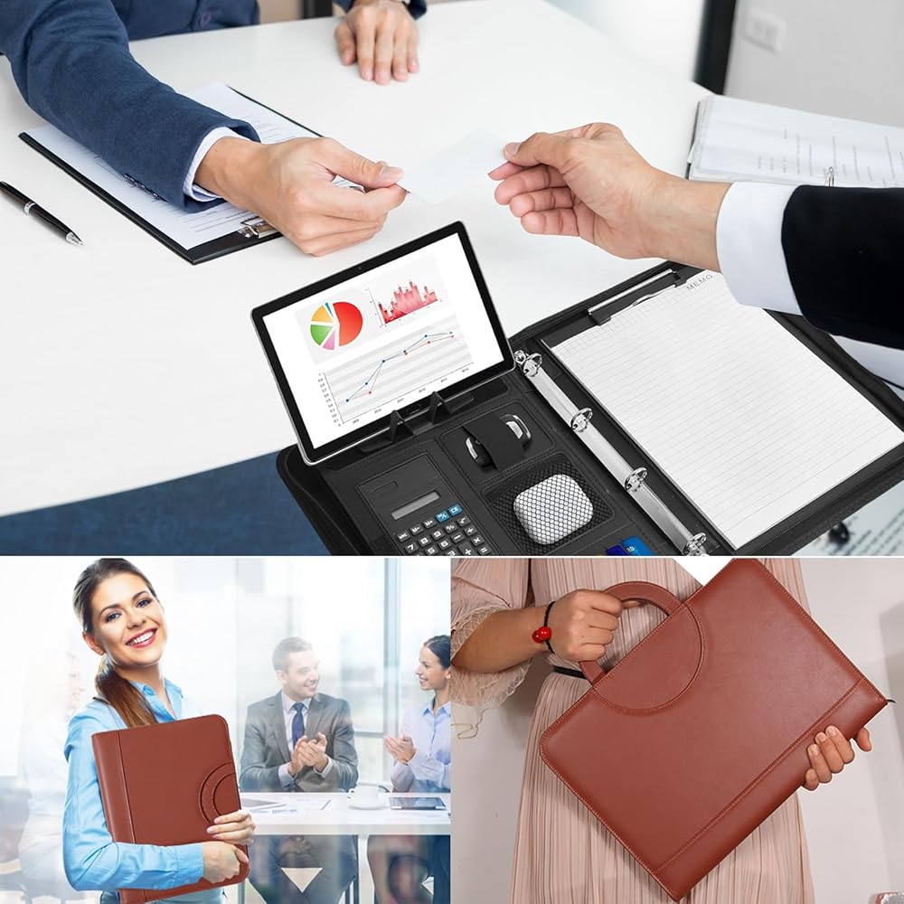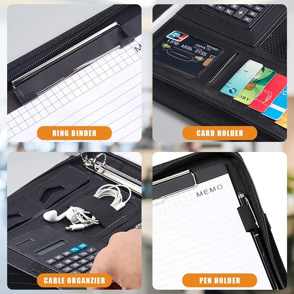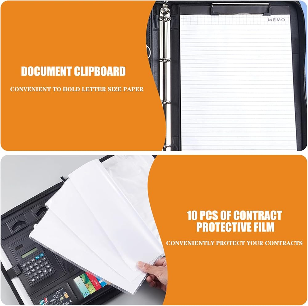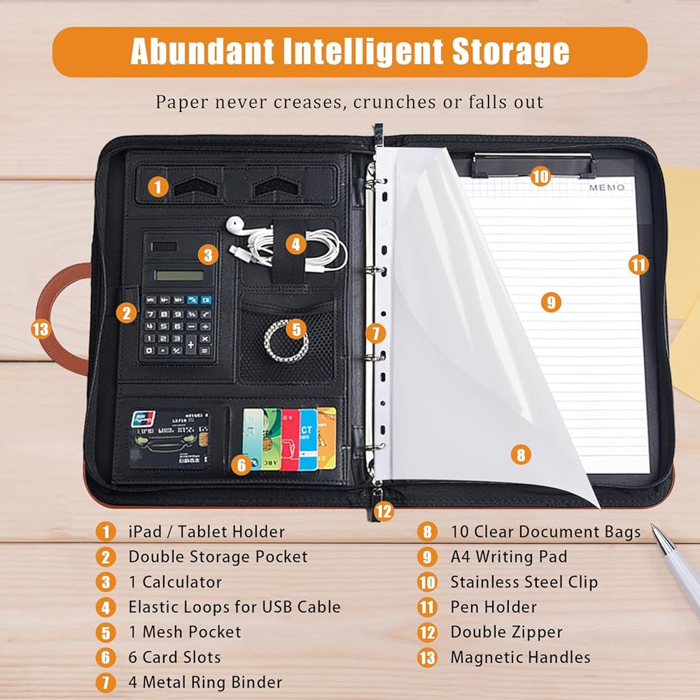 【مجلد مؤتمرات ذو سعة كبيرة】حافظة تحتوي على دعم للكمبيوتر اللوحي/الهاتف، وجيب كبير بطبقتين، وحلقة مرنة لكابل/شاحن USB، ولوحة كتابة A4 قابلة لإعادة الملء، و6 فتحات للبطاقات مع نافذة لبطاقة الهوية، وجيب شبكي واحد، وحافظة معدنية حلقية مع 10 جيوب شفافة للمستندات، ومشبك واحد من الفولاذ المقاوم للصدأ مع دفتر ملاحظات.