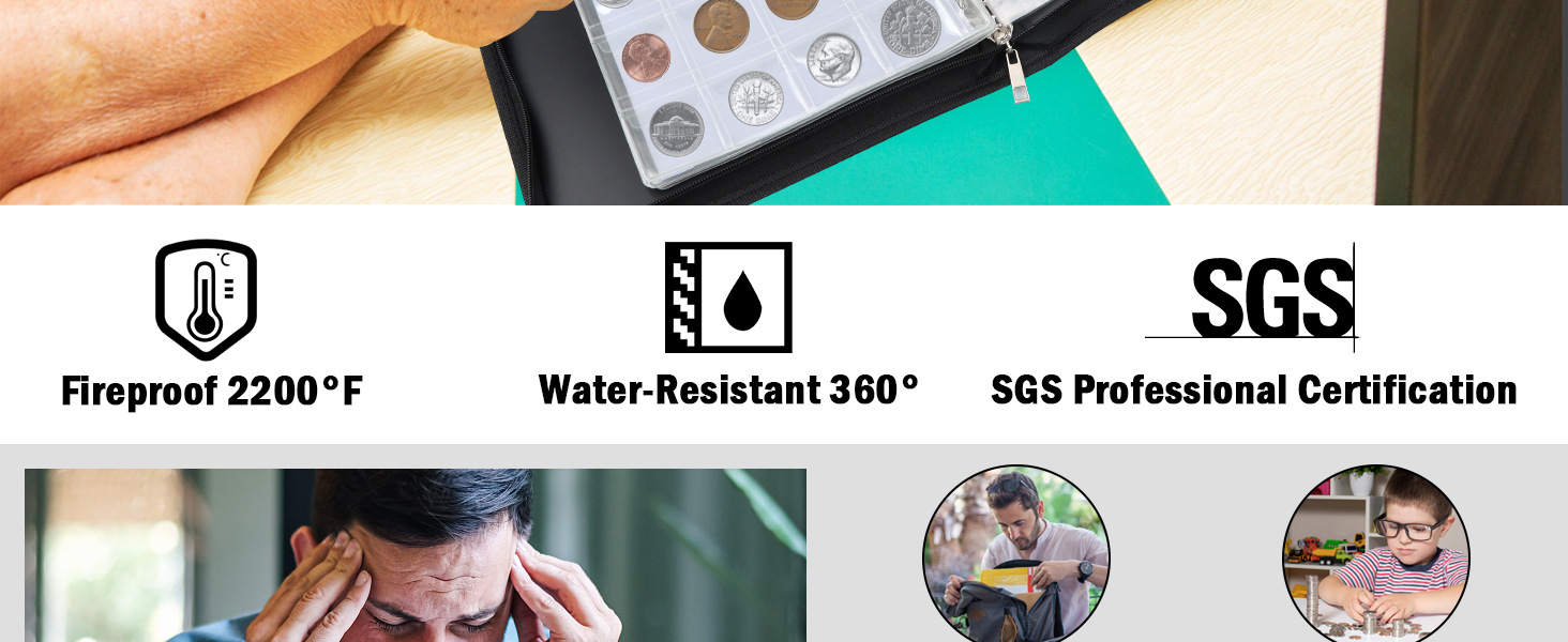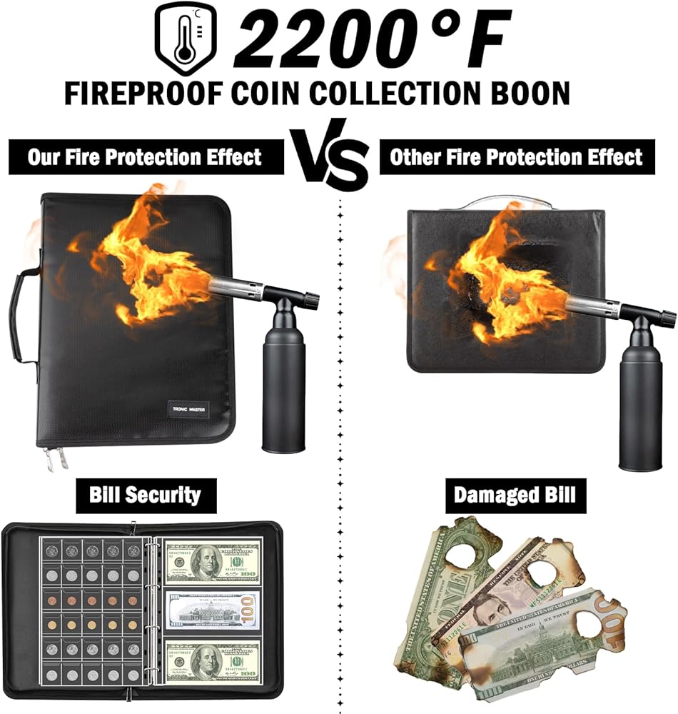 • مقاوم للحريق والماء: مصنوع من ألياف زجاجية مزدوجة الطبقات مطلية بالسيليكون لا تسبب الحكة، ويتحمل ألبوم تجميع العملات المعدنية الخاص بنا درجات حرارة تصل إلى 2000 درجة فهرنهايت، مما يضمن بقاء مقتنياتك الثمينة محمية في أي حادث حريق. بالإضافة إلى ذلك، فهو يوفر مقاومة عالية للماء، مما يحافظ على مجموعتك جافة ونظيفة.