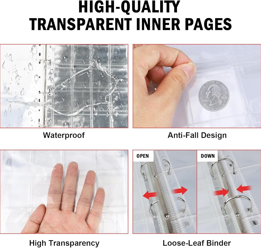 • ألبوم العملات المعدنية بمقبض وسحاب: يتميز كتاب مجموعة العملات المعدنية الخاص بنا بسحاب ناعم لحماية عملاتك الثمينة من السقوط، مما يمنحك حماية شاملة لعملاتك المعدنية. يوفر تصميم المقبض الكبير الراحة لك للحمل. يحتوي الجزء الداخلي من كتاب تجليد العملات المعدنية هذا على 4 حلقات من الفولاذ المقاوم للصدأ لإضافة أو إزالة الصفحات حسب حاجتك.