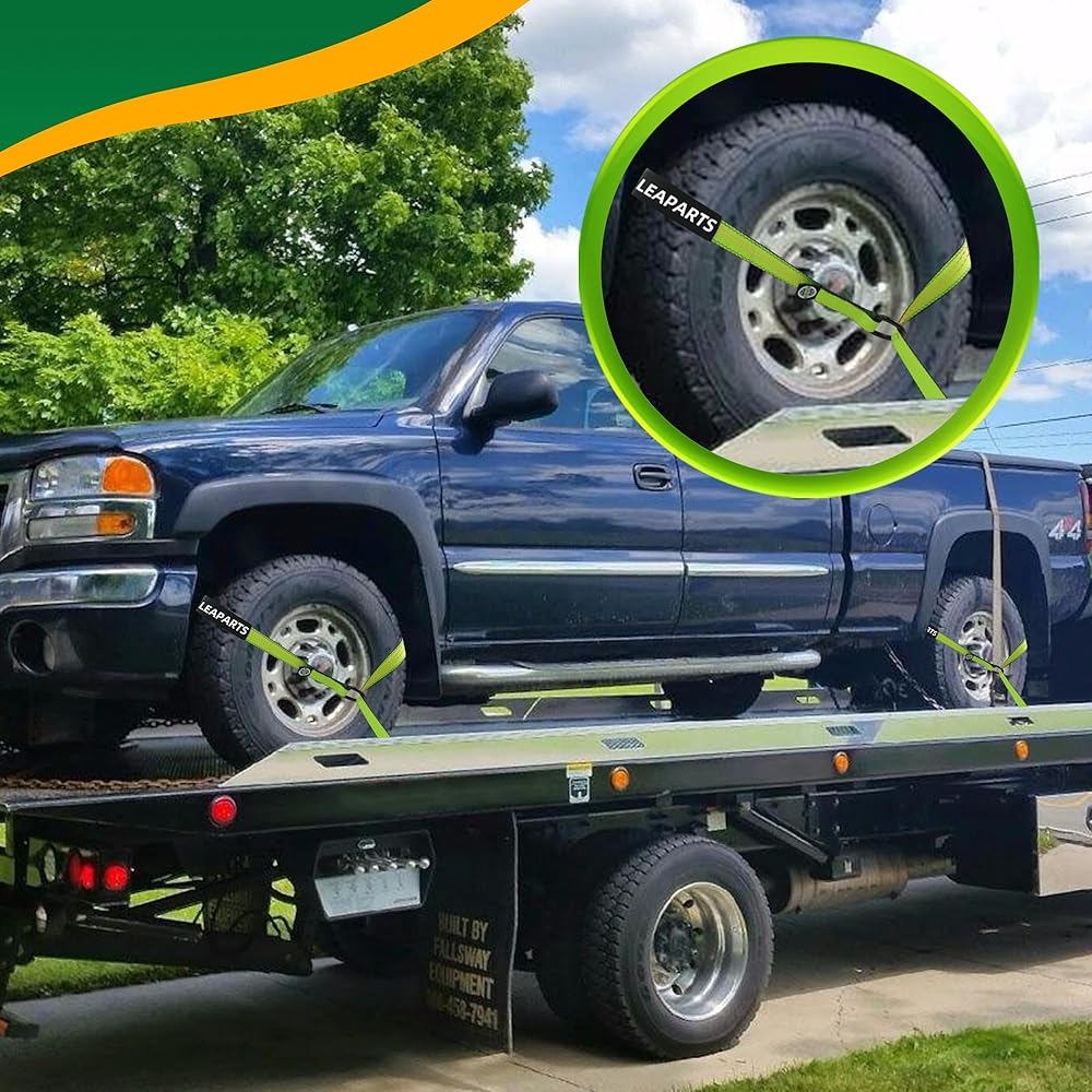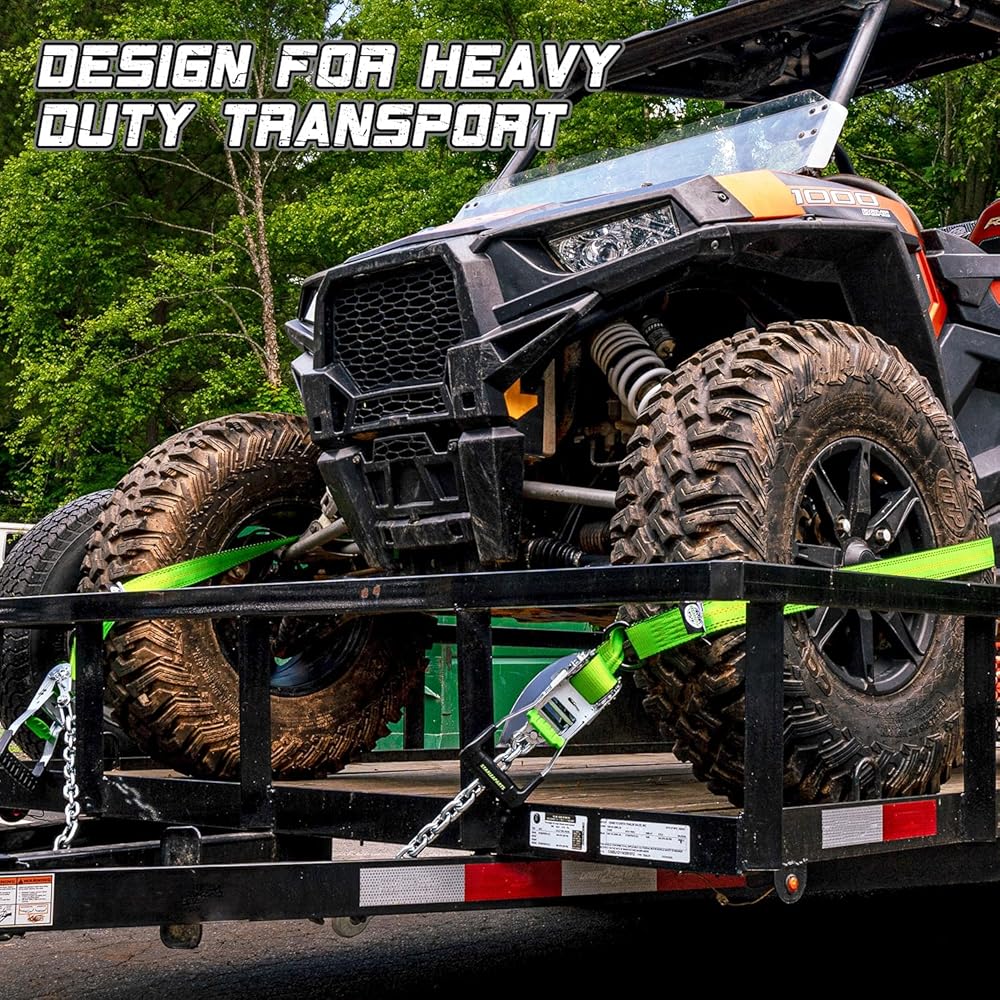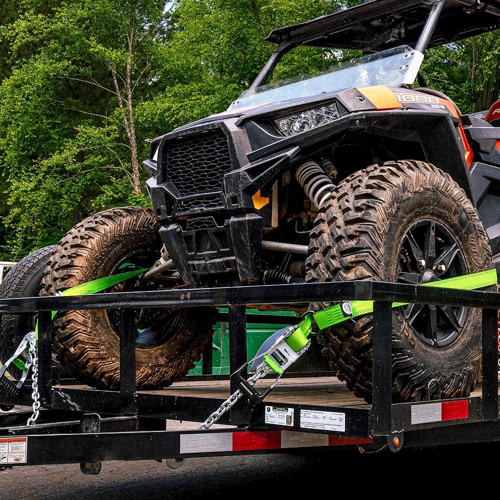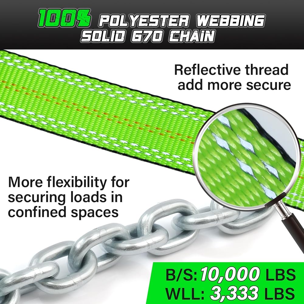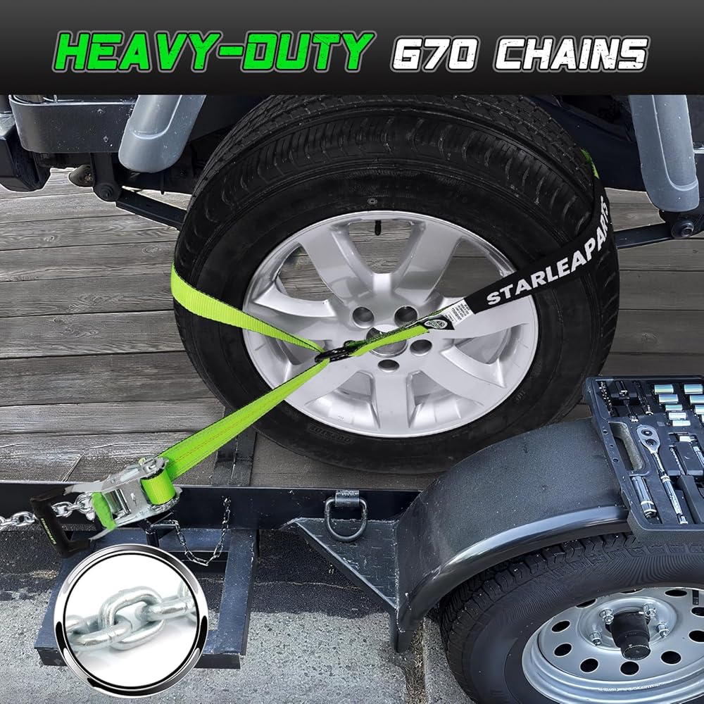 أحزمة عجلات ممتازة (4 قطع) - قوة كسر قصوى مضمونة 10.000 رطل - سقاطة 2 بوصة مع خطاف مرساة سلسلة G70 وحزام لاسو 2 بوصة × 8 قدم، أشرطة ربط مثالية للسيارة للشاحنات والسيارات وUTV (أخضر)
