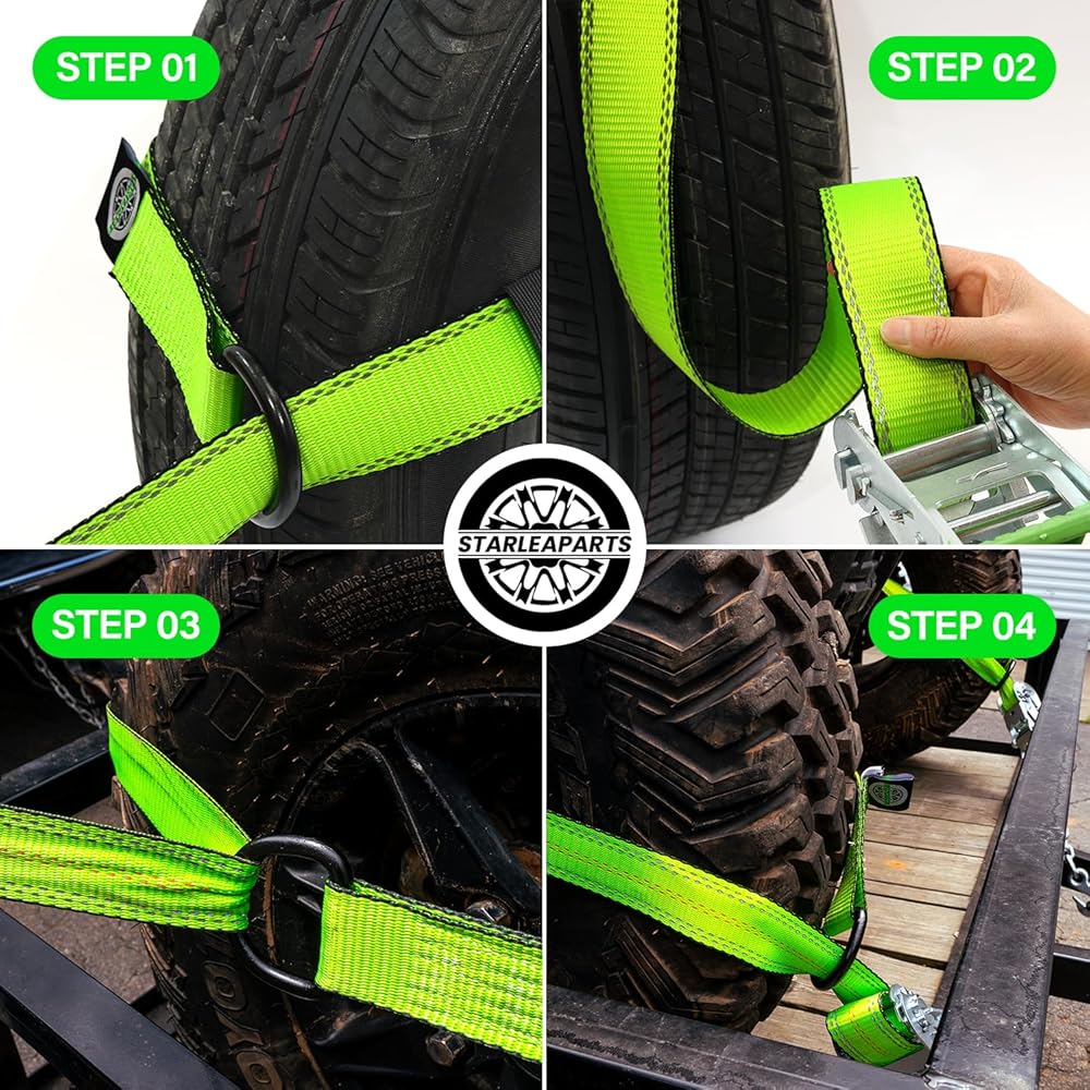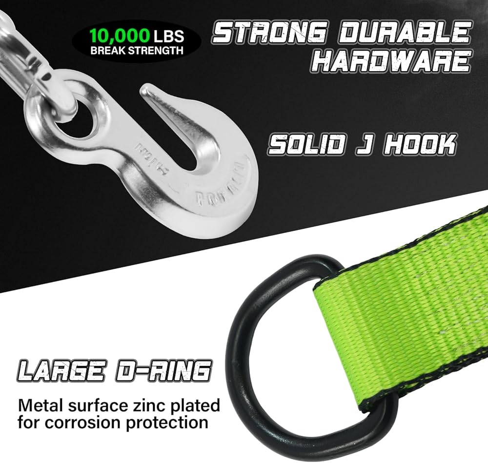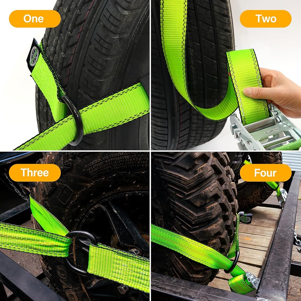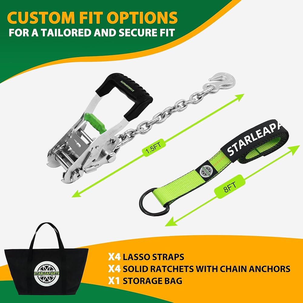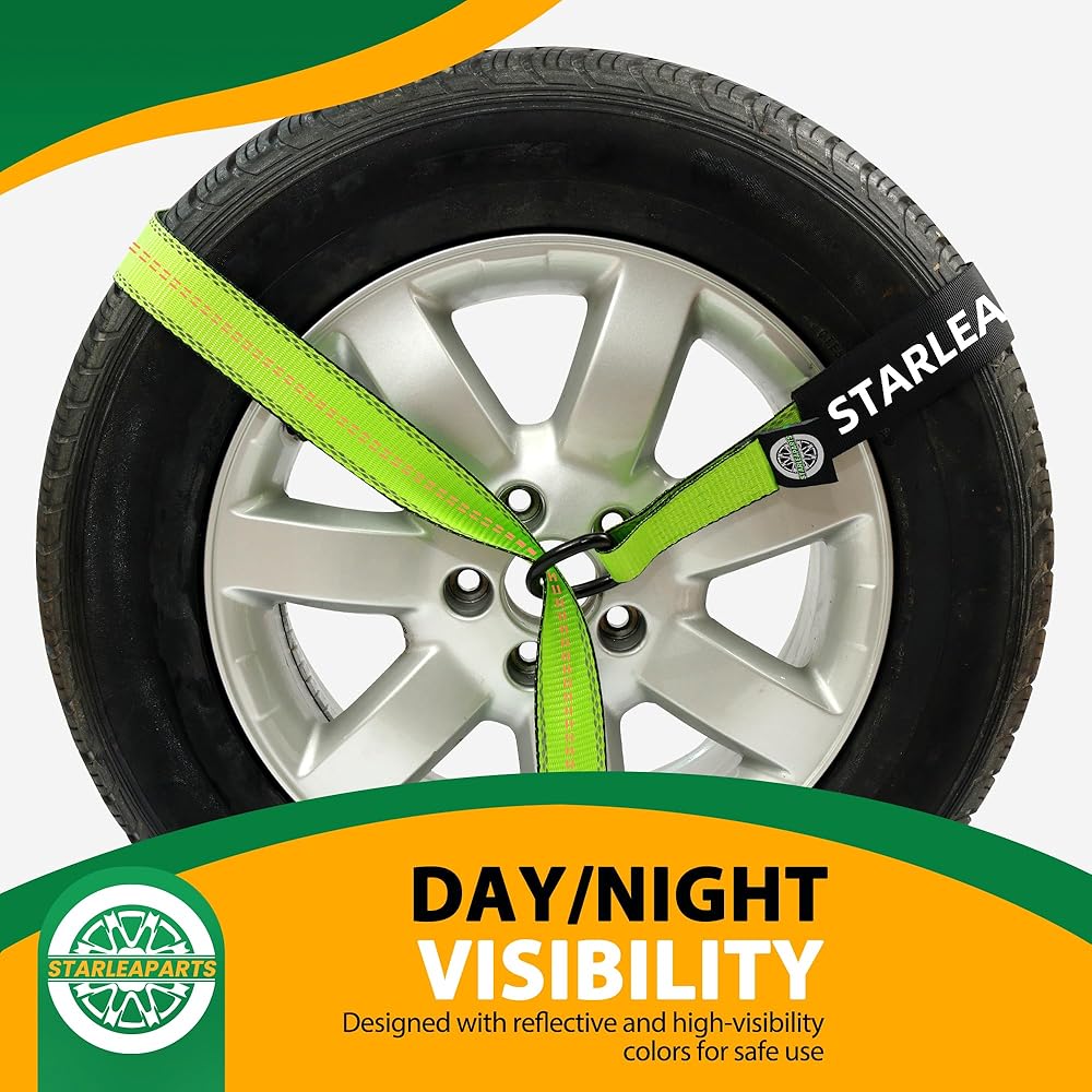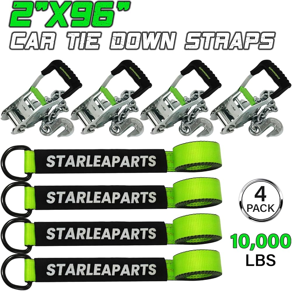 أحزمة عجلات ممتازة (4 قطع) - قوة كسر قصوى مضمونة 10.000 رطل - سقاطة 2 بوصة مع خطاف مرساة سلسلة G70 وحزام لاسو 2 بوصة × 8 قدم، أشرطة ربط مثالية للسيارة للشاحنات والسيارات وUTV (أخضر)