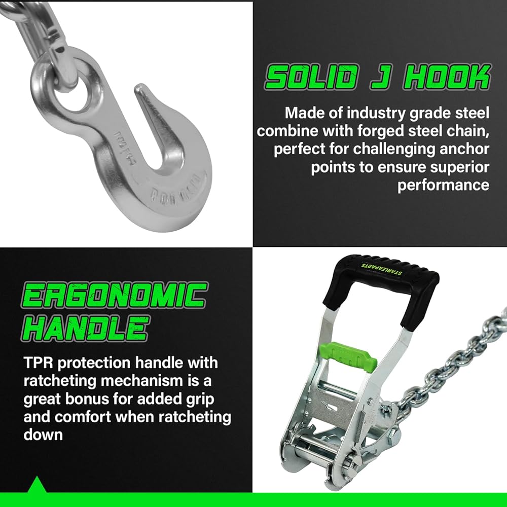 • 【نقل موثوق به】- تضمن الخطافات المزدوجة على شكل حرف J وآليات السقاطة ملاءمة آمنة ومريحة، مما يضمن بقاء سيارتك ثابتة في مكانها أثناء النقل على المقطورات والأسرّة المسطحة.