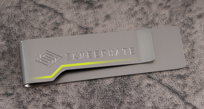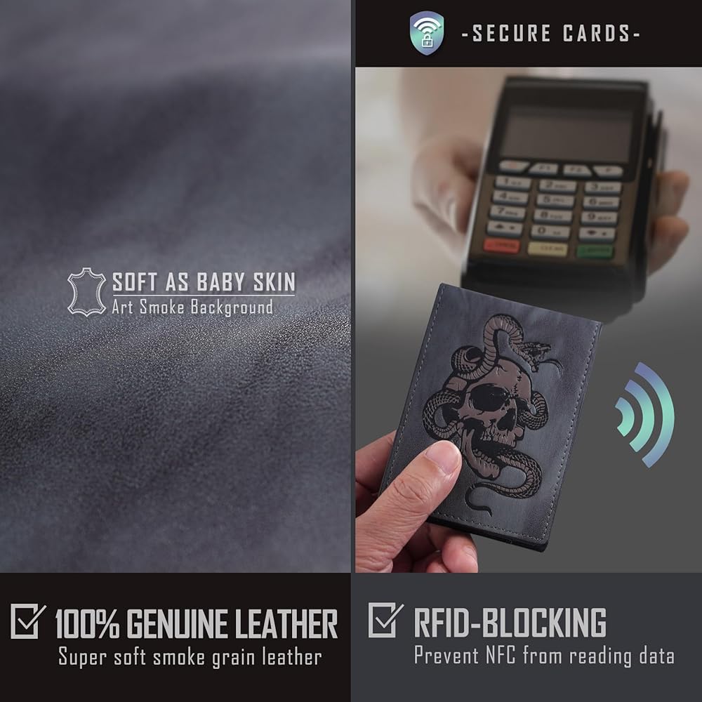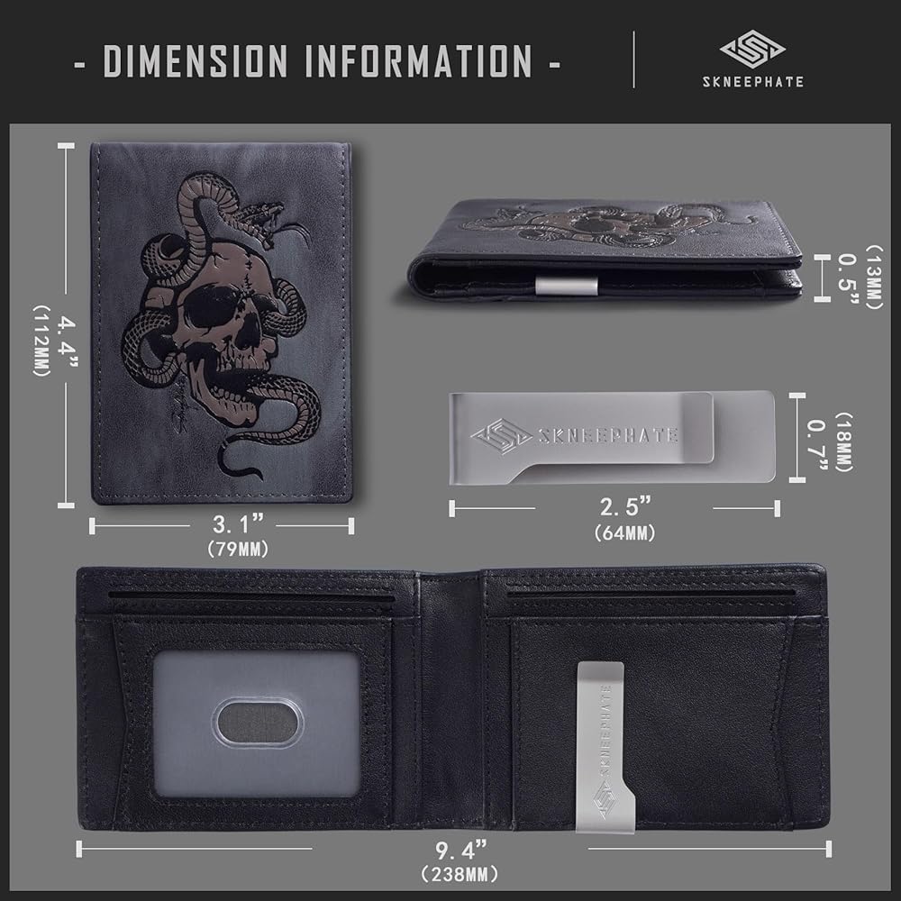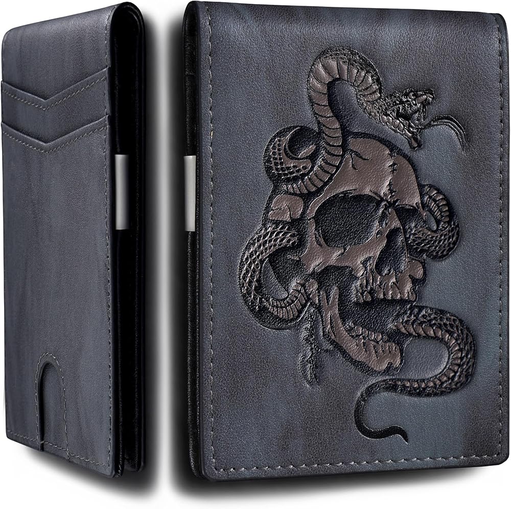 محفظة رفيعة للرجال مزودة بمشبك نقود وجيب أمامي على شكل جمجمة وحامل بطاقة ائتمان بسيط ثنائي الطي من الجلد الطبيعي مع خاصية حجب تحديد الهوية بموجات الراديو (رمادي)
