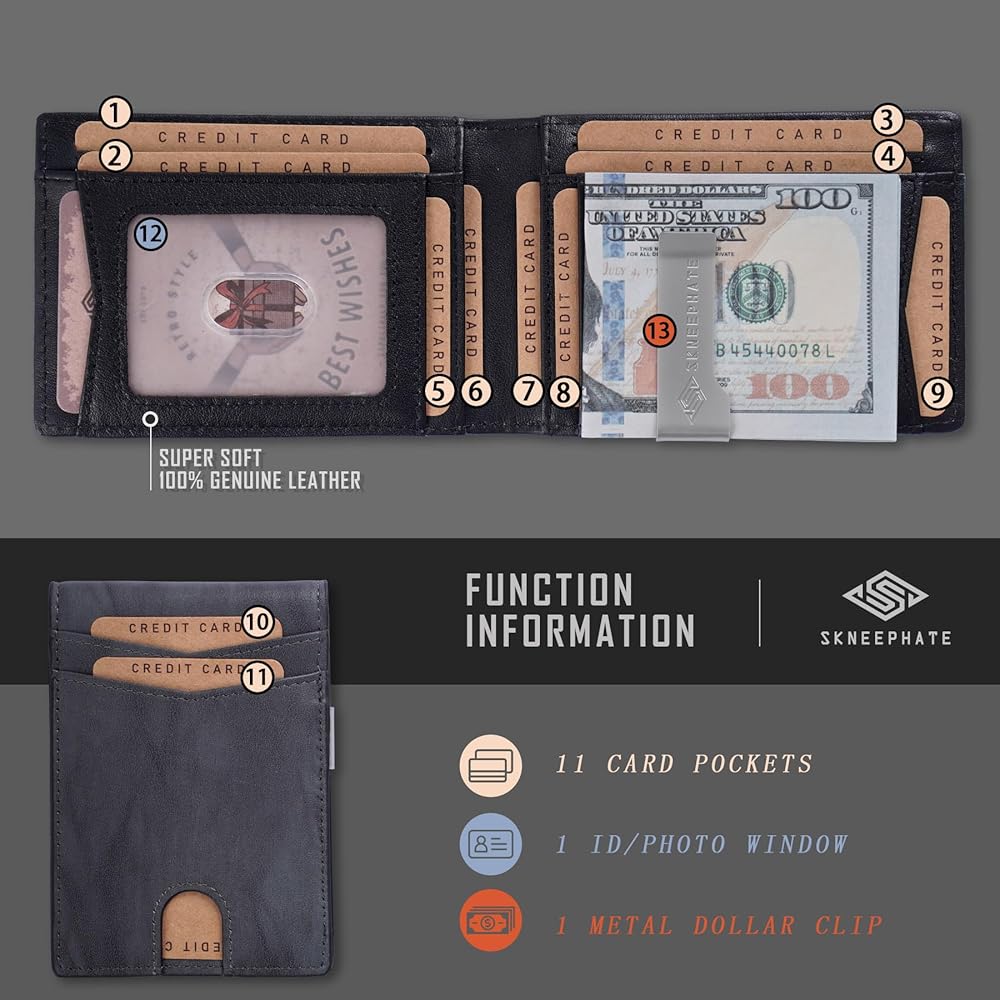 صغيرة ورفيعة: تحتوي هذه المحفظة الرفيعة على 11 فتحة للبطاقات، ونافذة لبطاقة الهوية، ومشبك معدني للنقود. يبلغ قياسها 4.4 بوصة × 3.1 بوصة × 0.5 بوصة فقط، وهي صغيرة الحجم وسهلة الحمل. سواء وضعتها في جيب قميصك، أو جيب بنطالك، أو حقيبتك، فإنها تشغل مساحة صغيرة جدًا.