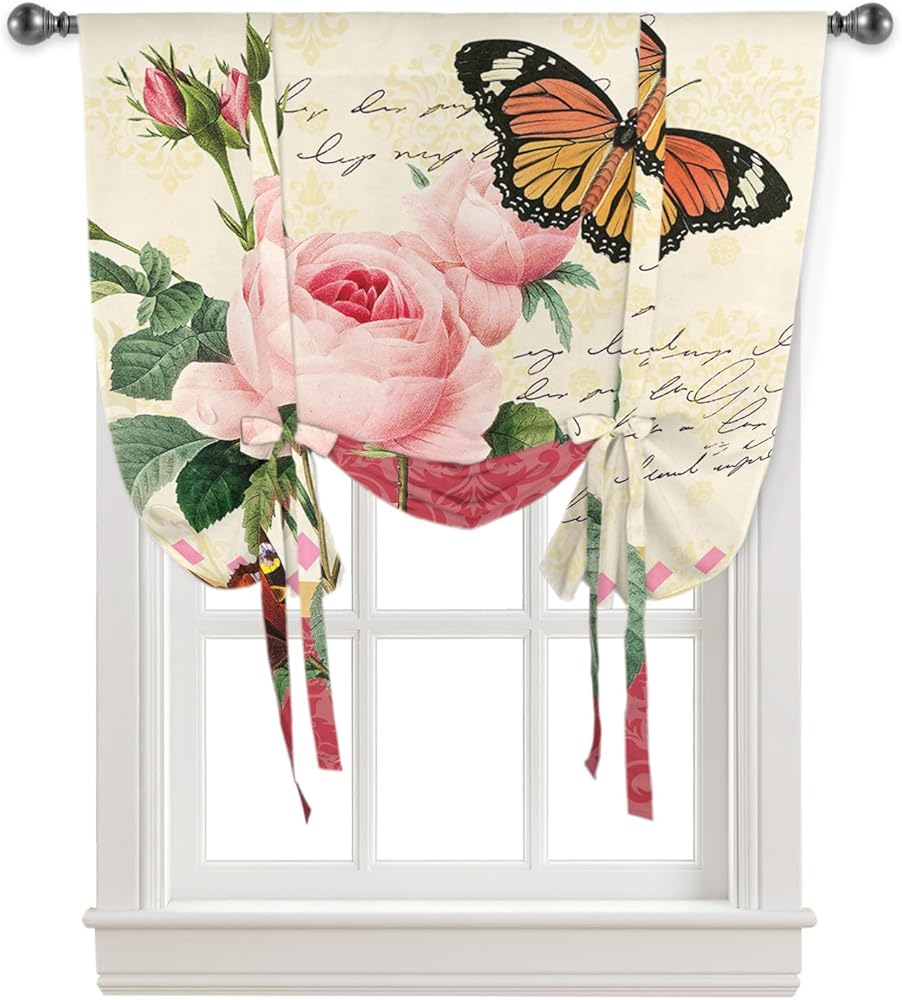 ربط الستائر ظلال النافذة، زهرة وردية نباتية عتيقة وقضيب فراشة جيب ربط نافذة الظل، ستارة بالون قابلة للتعديل للستائر وحمام المطبخ، لوحة واحدة، 34 بوصة × 45 بوصة