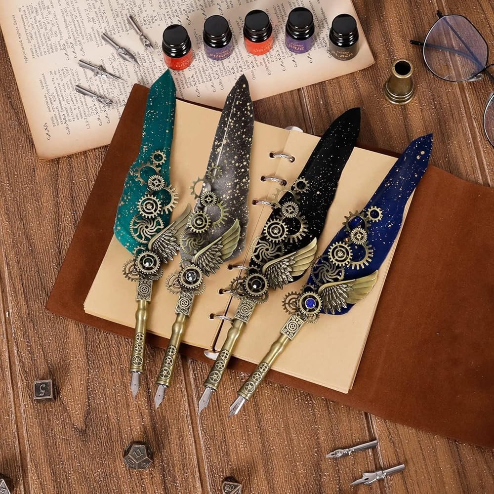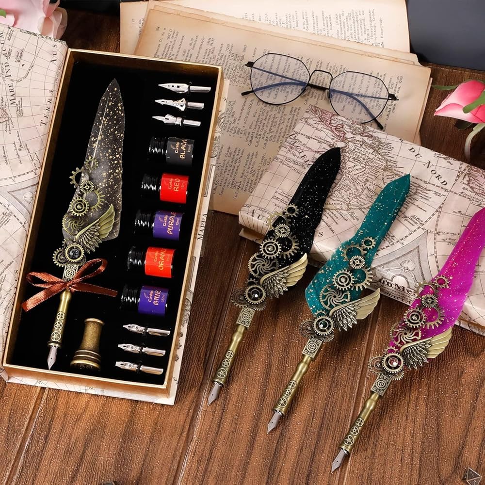 【قائمة العبوة】هذه مجموعة من أقلام الحبر والحبر من ريش البانك الخفيف، قلم لحاف واحد مع جسم قلم جناح تروس ميكانيكي، حامل أقلام واحد، 5 زجاجات من حبر ملون 7 مل (أحمر، أخضر، أزرق، أرجواني، أسود)، 6 سنون قابلة للاستبدال (3 سنون مسطحة، 3 سنون مدببة). ملاحظة: تم تصميم غطاء زجاجة الحبر بحشية مانعة للتسرب لمنع تسرب الحبر بشكل فعال.
