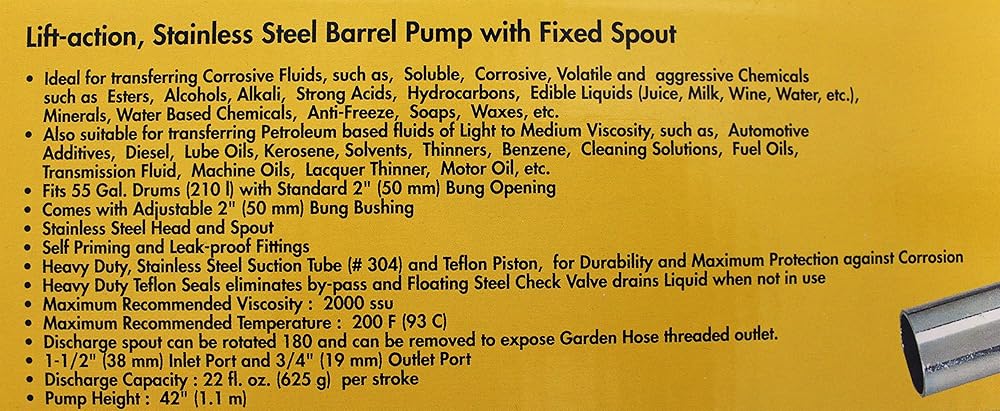 مضخة لوماكس LX-1331 مصنوعة من الفولاذ المقاوم للصدأ باللون الفضي مع فوهة فولاذية قابلة للإزالة. يناسب براميل سعة 55 جالونًا مع فتحة كبس قياسية مقاس 2 بوصة. مناسبة لنقل السوائل ذات الأساس البترولي.