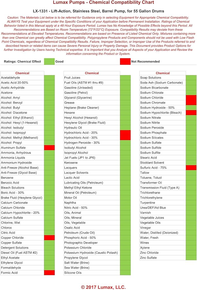 Lumax LX-1331 Lift-Action Silver Stainless Steel Barrel Pump with Removable Steel Spout. Fits 55 Gallon Drums with Standard 2” Bung Opening. Suitable for transferring Petroleum based fluids of Light to Medium Viscosity. Ideal for transferring Fluids that are Volatile and Chemicals such as Esters, Alcohols, Alkali, Acids, Edible Liquids (Juice, Milk, Wine, Water, etc), Minerals, Water Based Chemicals, Soaps, Waxes, etc. Also suitable for transferring Petroleum based fluids of Light to Medium Viscosity, such as, Automotive Additives, Diesel, Lube Oils, Kerosene, Solvents, Benzene, Cleaning Solutions, Fuel Oils, Transmission Fluid, Machine Oils, Lacquer Thinner, Motor Oil, etc. Discharge Capacity: 22 fl. oz. (625 g) per Stroke. Pump Height: 42" (1. 1 m). Lumax is a manufacturer of lubrication and fluid management products. Our products, including grease guns, manual and electric pumps, funnels, drains, grease fittings, filter wrenches, and accessories, are built to the highest standards and incorporate many proprietary features. Lumax's mission is to provide professionals and consumers with innovative and high-quality products to get the job done right. Product development at Lumax goes beyond the physical product, to a deeper understanding of the end-users' needs. Engineered with the "user-in-mind, " Lumax products are built to the highest standards and incorporate many unique features that make work easier, faster and cost-effective. We have a passion for the design process. We listen to our customers and their ever-expanding requirements. Our unique products lead the field in design, quality, and performance.