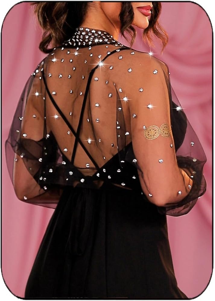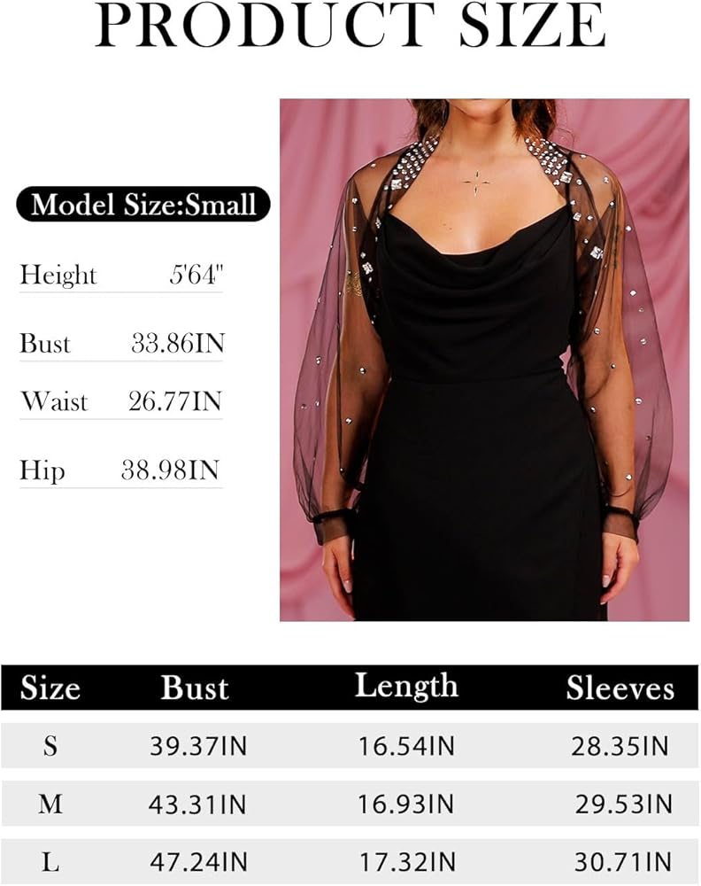 Gorais Women Crystal Tulle Bolero Shrug Long Sleeve Jacket for Evening Dresses. Black Tulle Shrug Gothic Bridal Wedding Jacket for Dresses Formal. Sparkly Rhinestone Black Sheer Cardigan Halloween Costume for Women. Bolero is a formal style, ideal for evenings, weddings, wedding reception, cocktail parties, proms,dates, birthdays or other formal occasions. Wear with wedding dresses, long gowns, little black dresses and more for an elegant and glamorous look. It can also be worn with everyday outfits for an unexpected effect. Wear it with sleeveless dresses, slip dresses, halter dresses, tank tops or strapless tops, for a sexy, gentle or generous look. Shrug is a simple, pure design with long sleeves.It is the classic tulle bolero. Bridal bolero is made of a sheer tulle fabric. Lightweight and breathable, soft and skin-friendly. It is very light and easy to carry. It will be delivered to you in a Kraft box. It is hazy and oozes a little sexiness. It is more suitable for the cooler months, or for moderate temperatures indoors. Tulle shrug is available in three sizes. It's loose enough to be comfortable and doesn't feel restrictive, making it a perfect arm cover-up. Wear it to take beautiful photos with personality and the endless compliments will follow you, giving you the pleasure of exceeding expectations. Choose this classic bolero for yourself, the beautiful bride, on your grand day. It will be the perfect addition to your wedding dress or gown. If you're going to a party where dress code is a requirement, then go for it, with just a little simplicity to still show off your beautiful little dress, adding layers while easily hiding any insecurities. You can relax and show yourself off and receive great compliments.