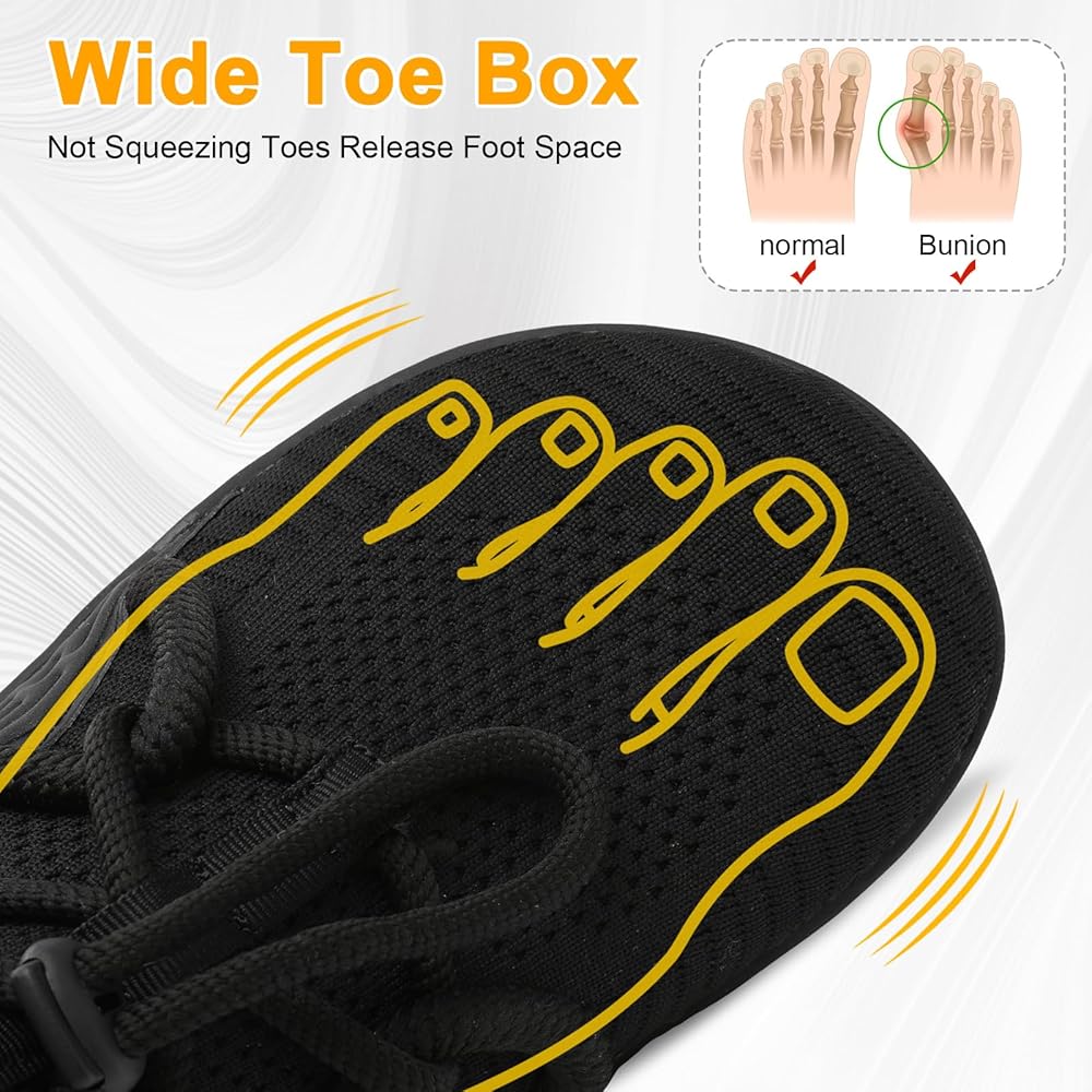• صندوق عريض لأصابع القدم: بما في ذلك مساحة ممتدة لحرية حركة أصابع القدم، تم تصميم أحذية بيرون حافية القدم خصيصًا للأشخاص ذوي الأقدام العريضة والأشخاص الذين يعانون من مشاكل القدم مثل التهاب اللفافة الأخمصية، والقدم المسطحة، والقدم السكرية، والأورام وأصابع القدم المطرقة.