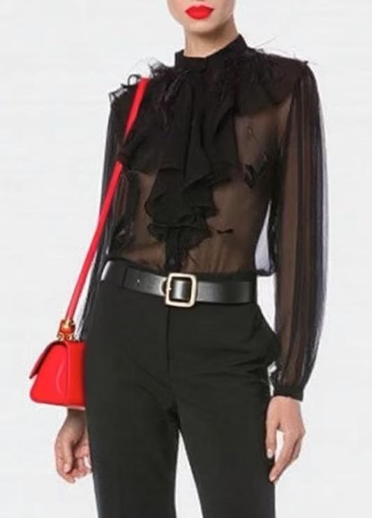 This transparent women's top combines feather trim on the collar with ruffle details to create a delicate and elegant appearance. It is made of lightweight fabric, suitable for various body types, while providing breathability and comfort. Its transparent design not only adds a sense of mystery, but can also be paired with various underwear, high waisted pants or skirts to create a diverse and versatile personal style. It is very suitable for leisure, evening activities, and office attire, and is a must-have item in fashionable wardrobes