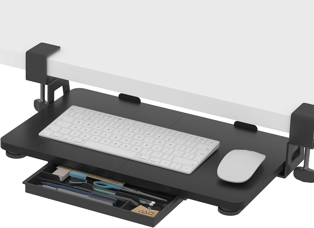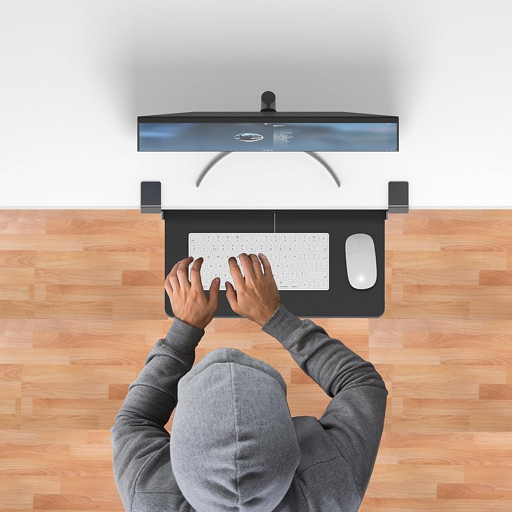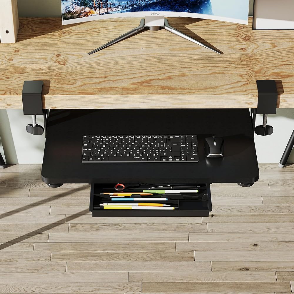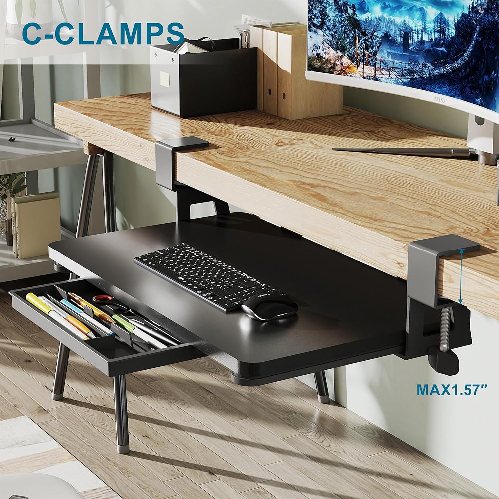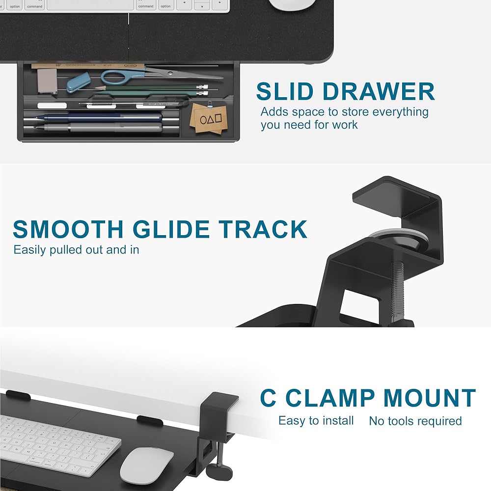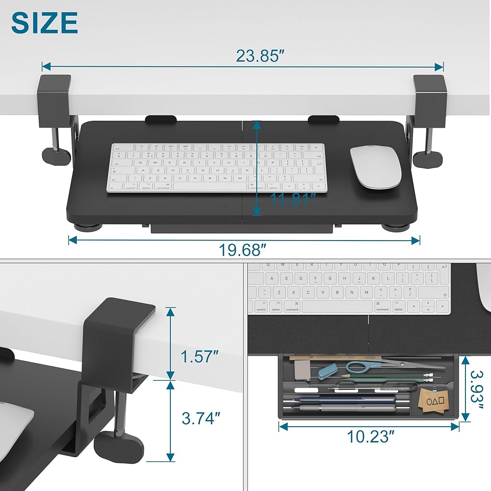 ETHU صينية لوحة المفاتيح أسفل المكتب، 19.7 بوصة × 11.81 بوصة، درج لوحة مفاتيح صغير الحجم مع مشبك C سهل التركيب، حامل لوحة مفاتيح الكمبيوتر منزلق للخارج، صينية لوحة مفاتيح مريحة للمنزل والمكتب، أسود