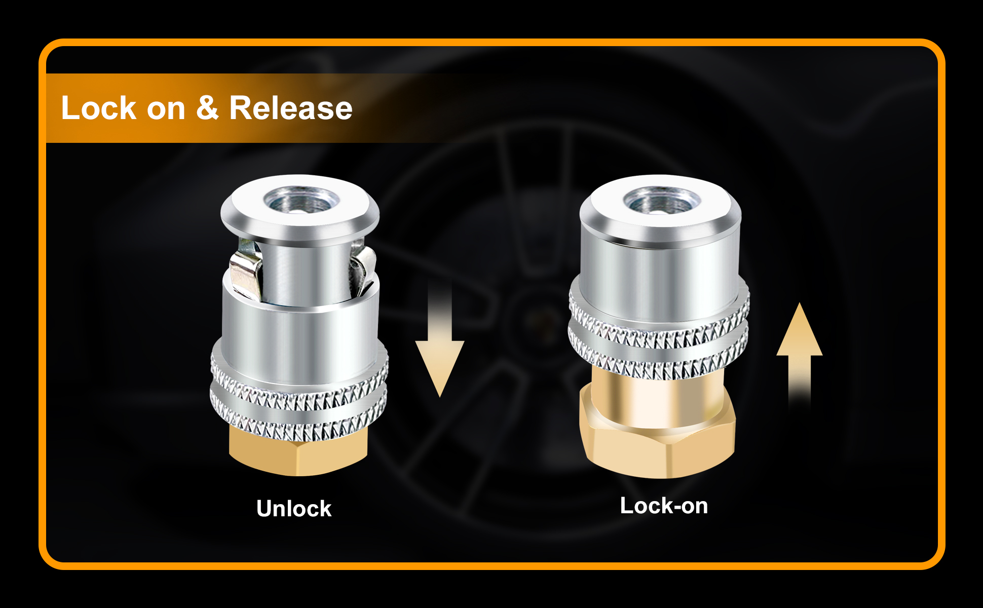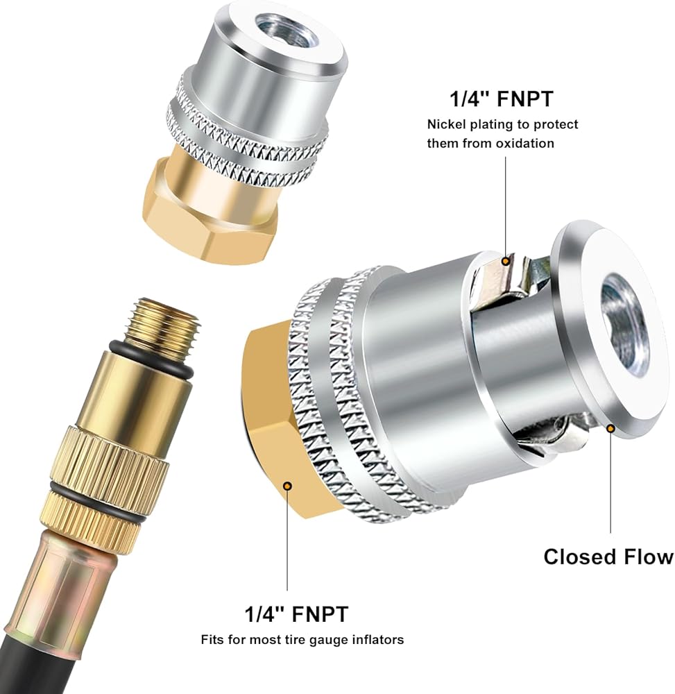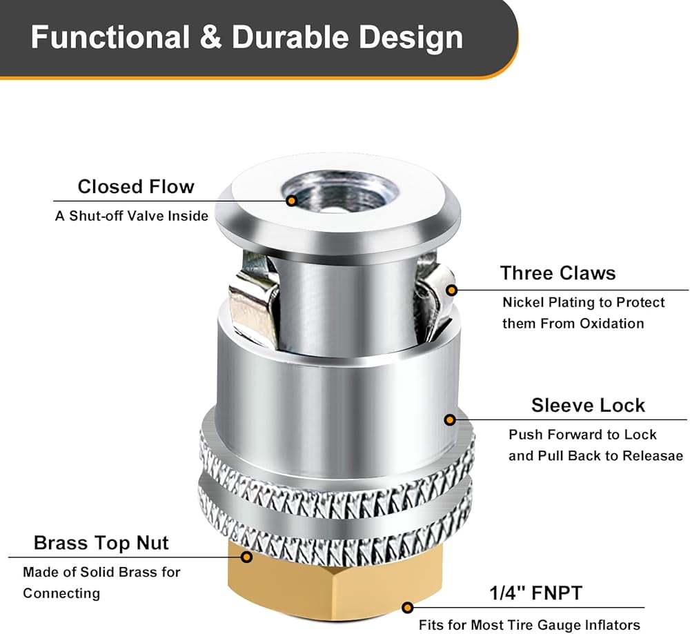 • ملاءمة آمنة: تضمن آلية القفل 1/4 FNPT المصممة بدقة اتصالاً محكمًا وموثوقًا مع منفاخ الإطارات، مما يمنع تسرب الهواء ويضمن النفخ الفعال.