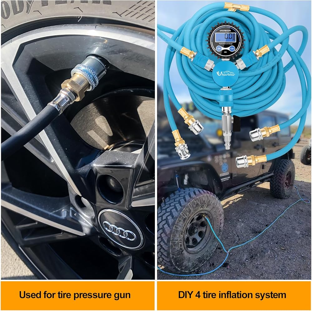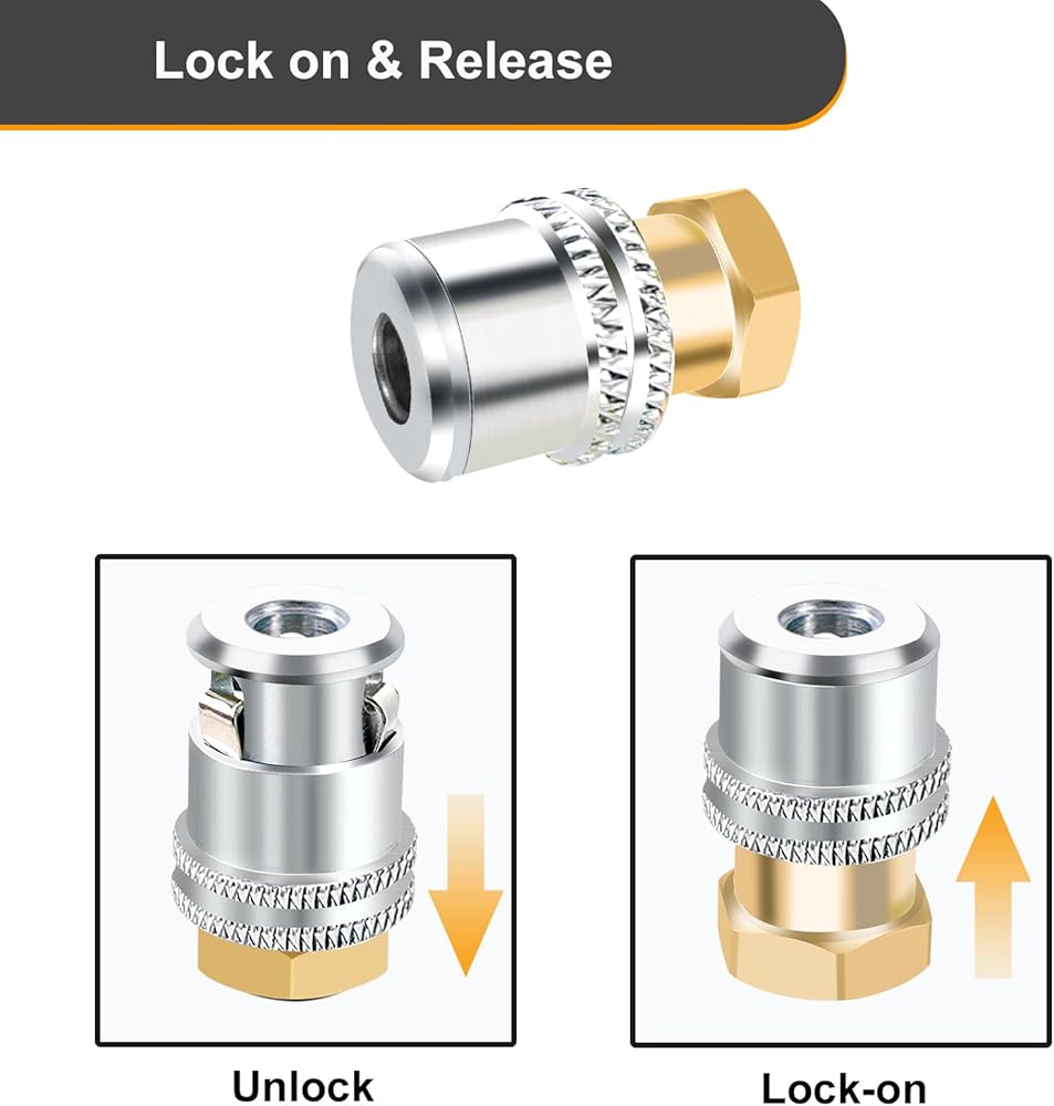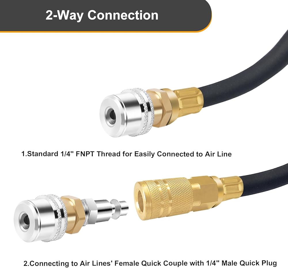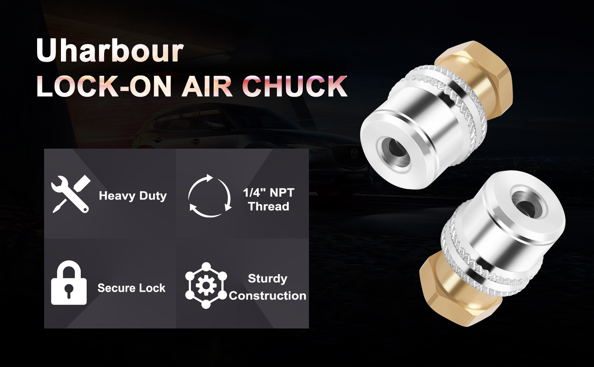 • ملاءمة آمنة: تضمن آلية القفل 1/4 FNPT المصممة بدقة اتصالاً محكمًا وموثوقًا مع منفاخ الإطارات، مما يمنع تسرب الهواء ويضمن النفخ الفعال.