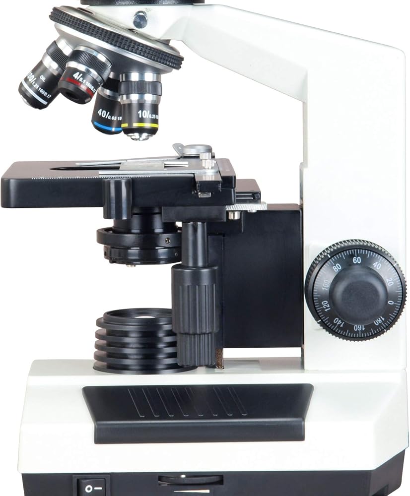 Nosepiece: revolving quadruple; Stage: mechanical stain-resistant double layer size 5-1/2inch x 5-1/2inch (140mm x 140mm), translation range: 3inch x 2inch (75mm x 50mm); Focus: coaxial coarse and fine focus knobs on both sides, rack and pinion adjustment, with tension control; Focusing knob can be locked for observation and transportation; Condenser and diaphragm: NA1.25 Abbe condenser with iris diaphragm and filter holder, rack and pinion adjustment