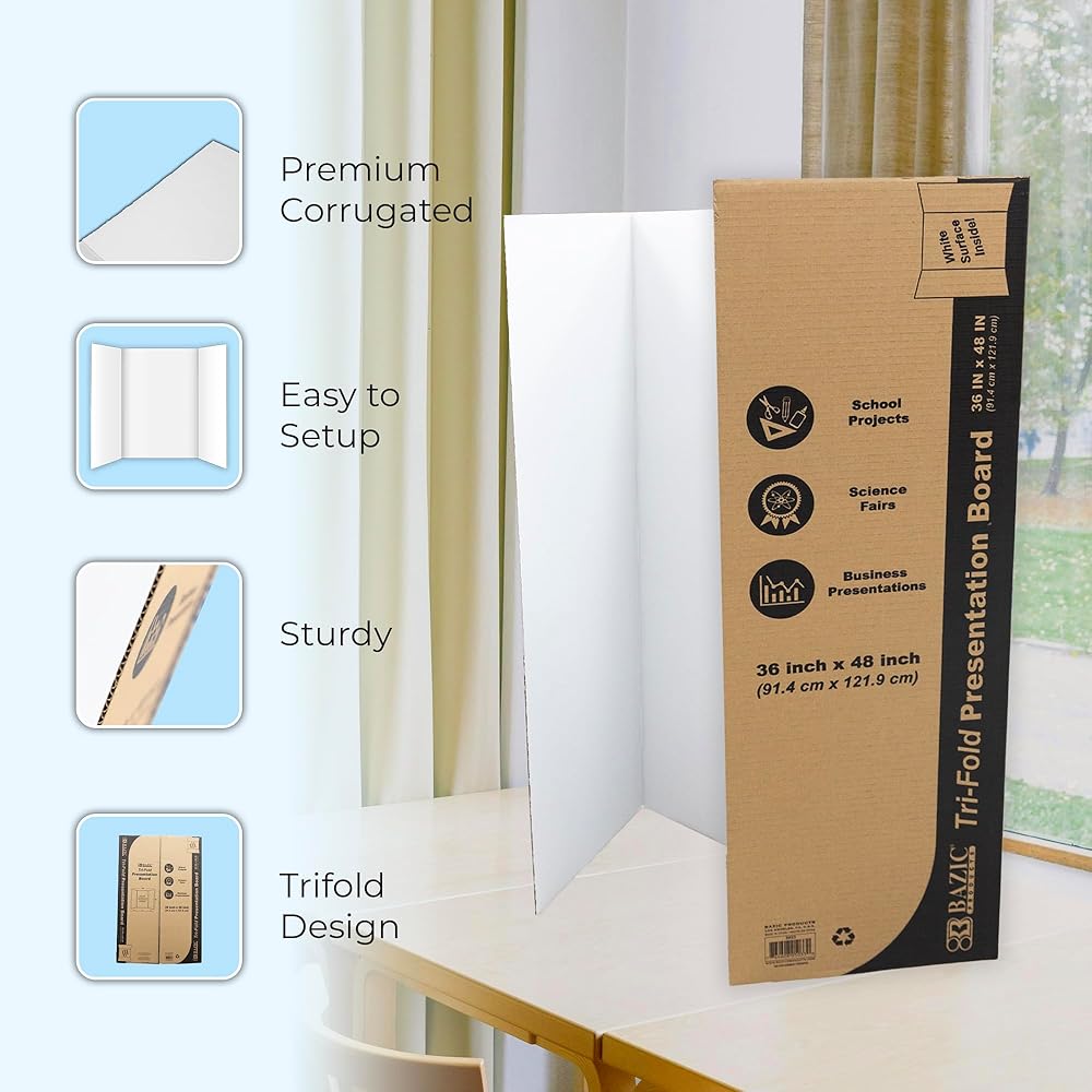 لوحة عرض ثلاثية الطي من BAZIC، مقاس 91.44 سم × 111.48 سم، بيضاء، لوحات ملصقات مموجة ثلاثية الطي، ورق مقوى لعرض لوحات المشروع الفني للمعرض العلمي، حزمة واحدة