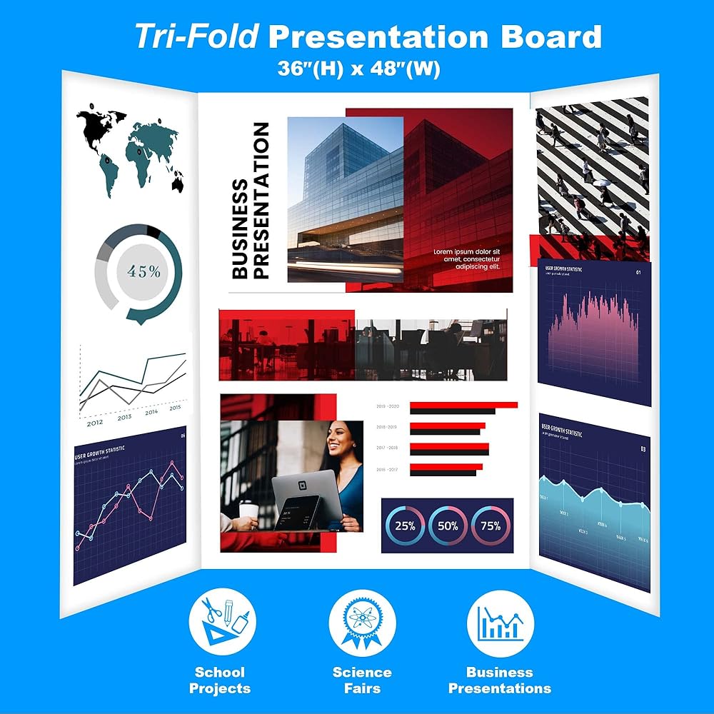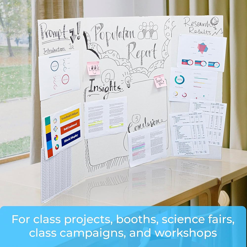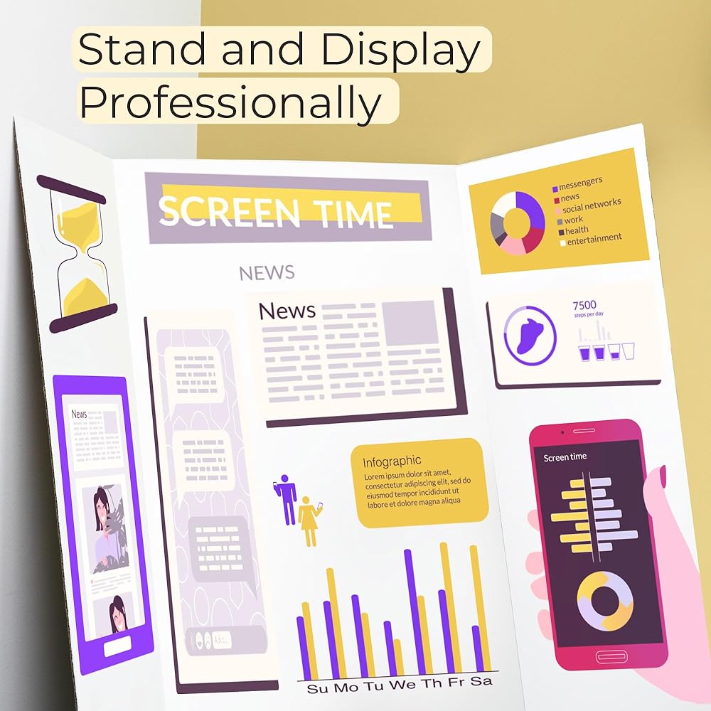 ⭐ SELF-STANDING. Tri-fold corrugated display poster boards. Pre-scored panels fold out for instant set-up. Foldable for easy storage and transport. Rigid yet lightweight and portable.