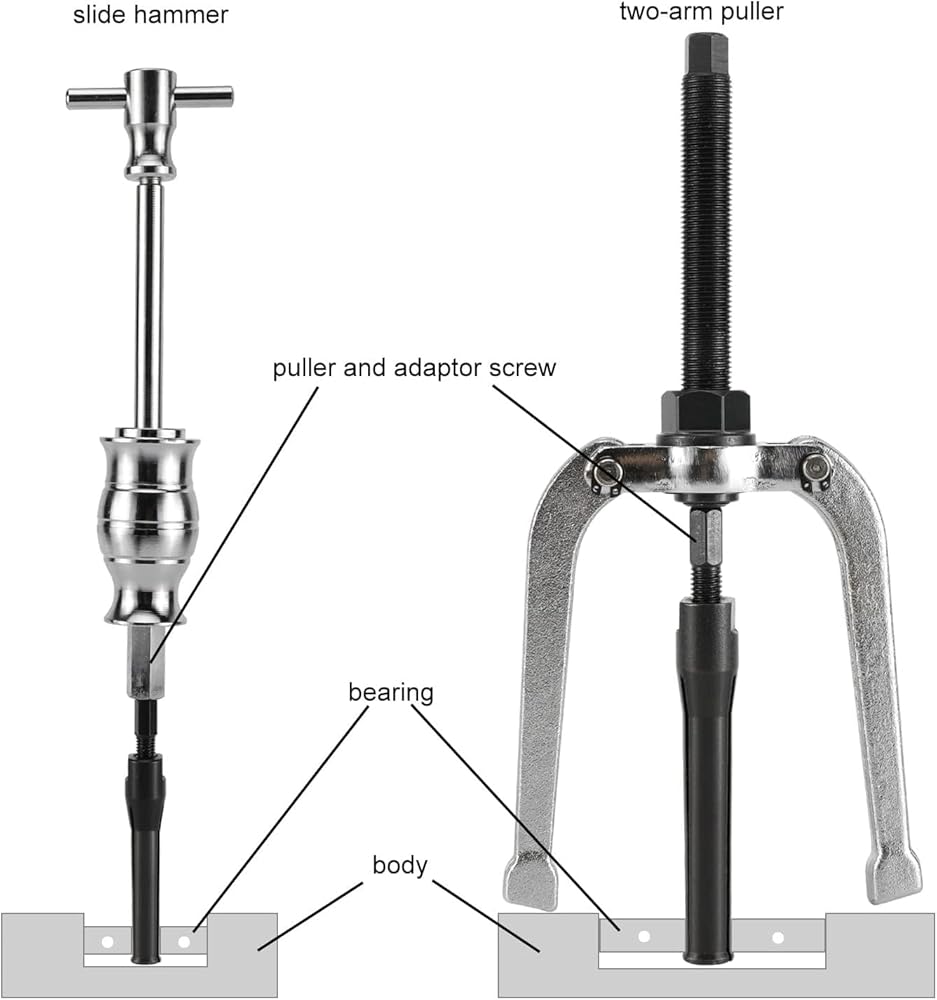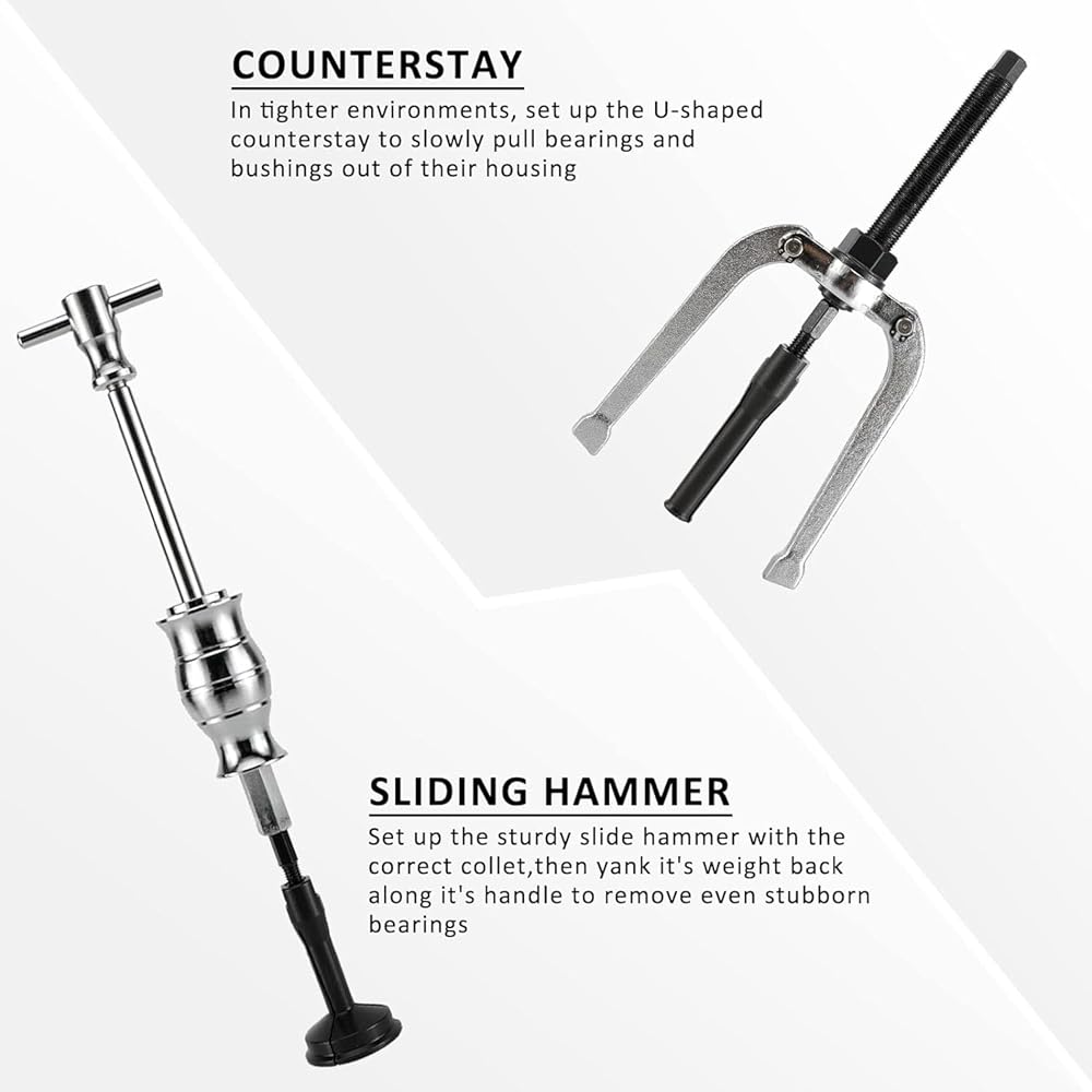 • سهلة الاستخدام: أدخل أولاً الطوق المناسب، وأدر الصمولة لتوسيع الطوق حتى يصبح آمنًا داخل المحمل، ثم اسحب وزن المطرقة المنزلقة للخلف لإخراج المحمل أو الجلبة بسهولة. من أجل تشغيل أكثر إحكامًا أو دقة، يمكن تشديد دعامة العداد ببطء لاستخراج الجزء بعناية أكبر.