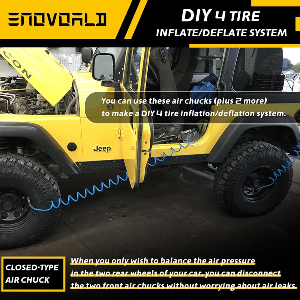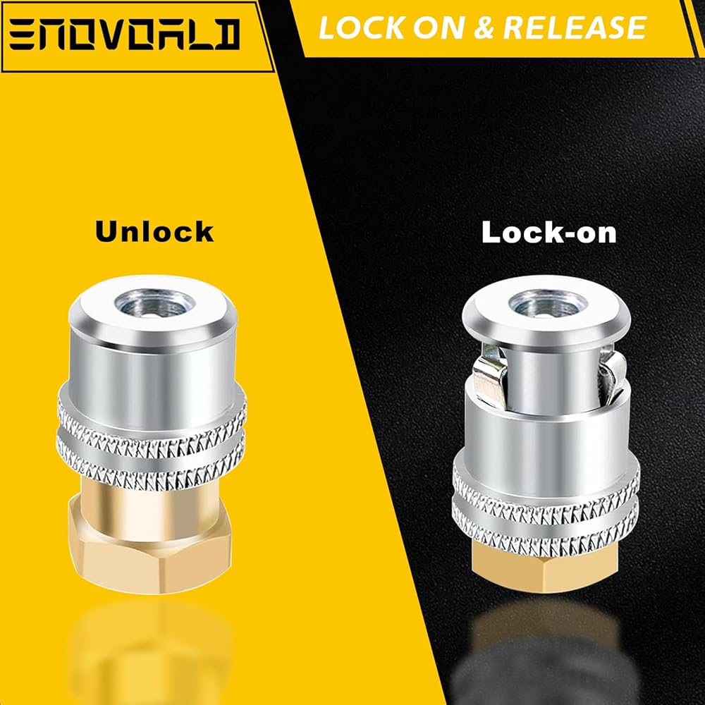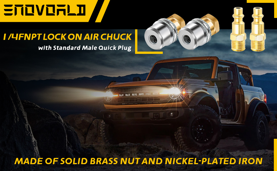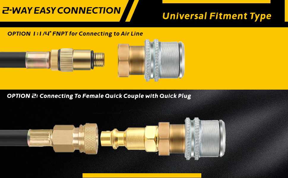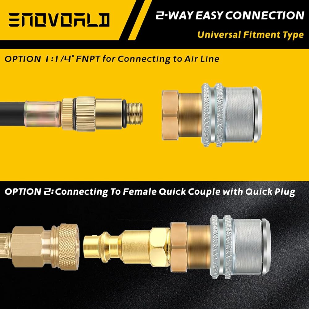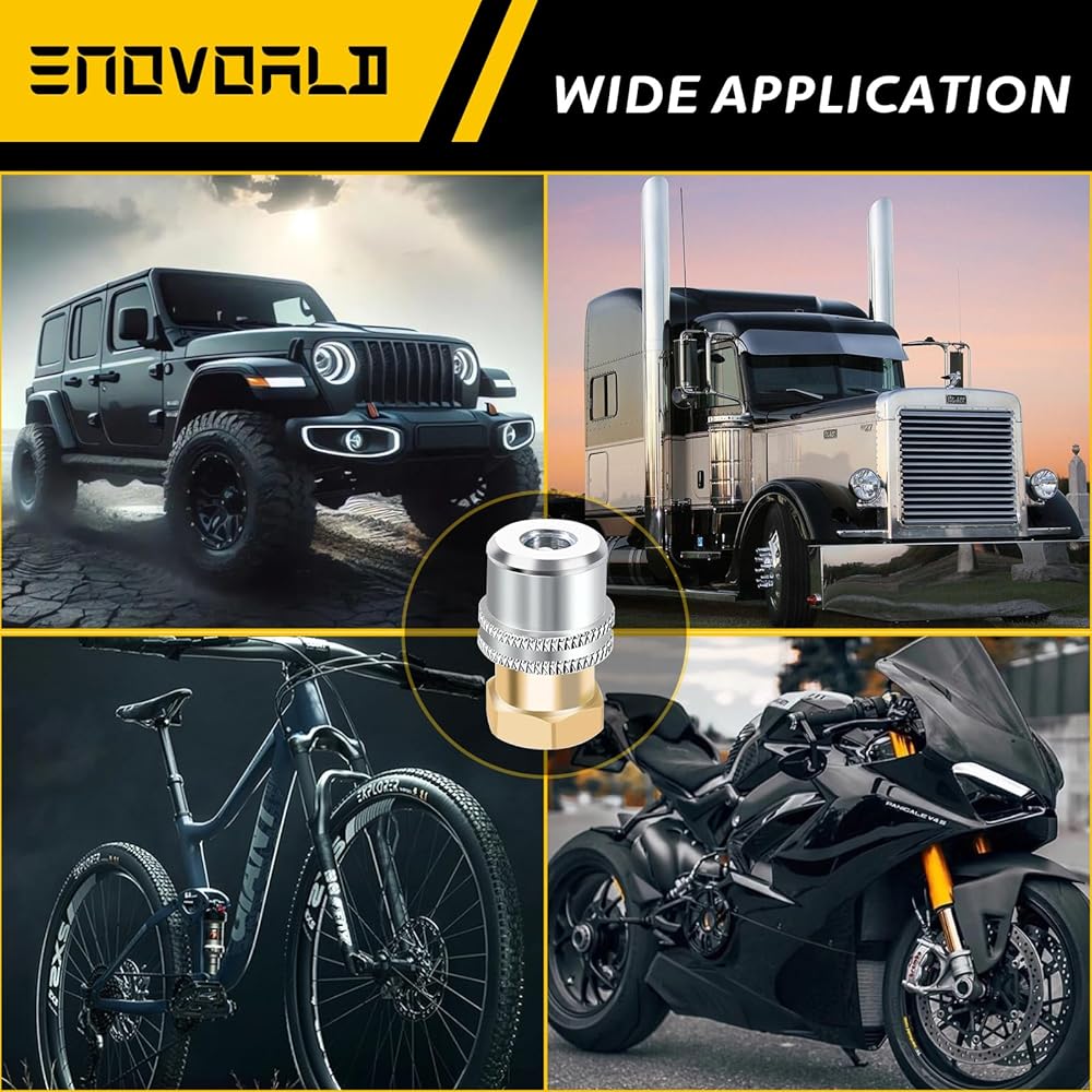 【مواصفات ظرف هواء الإطارات】يتميز بخيط NPT أنثى 1/4 بوصة للتوصيل بسهولة بخطوط الهواء أو ضاغط الهواء أو مقاييس نفخ الإطارات لتضخم الإطارات، بحد أقصى يصل إلى 150 رطل لكل بوصة مربعة من ضغط الهواء. يتضمن أيضًا قابس ذكر سريع قياسي 1/4 بوصة كن اختيارًا احترافيًا لنفخ الإطارات بسرعة.