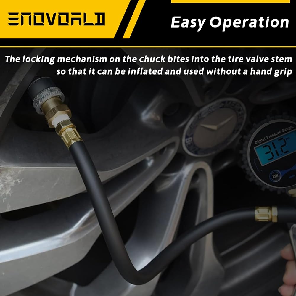 【تشغيل سهل】عندما يتم دفع ظرف إطار السيارة للأمام، فإن آلية القفل الموجودة على ظرف الظرف تعض في جذع صمام الإطار بحيث يمكن نفخه واستخدامه بدون قبضة اليد. ويمكن حتى استخدامها بيد واحدة، وربطها بإحكام بصمام شريدر.