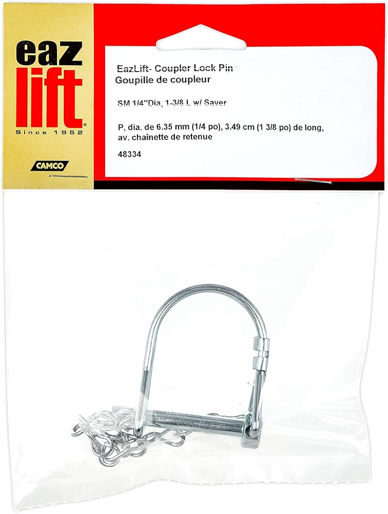 The Eaz-Lift Small Coupler Lock Pin with Saver Chain allows you to keep your trailer latch securely fastened to the trailer ball. The provided saver chain attaches to your coupler for additional security. It has a pin diameter of 1/4-inches with a usable length of 1-3/8-inches. The coupler lock pin has a round shaped retainer pin that allows enough clearance for the coupler latch. Constructed of zinc-plated steel that is corrosion resistant.