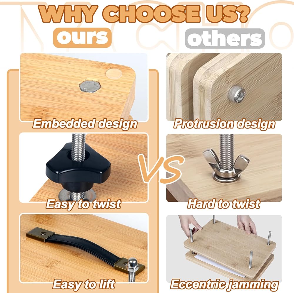 【مزيد من الثبات】: تتميز أدوات ربط الكتب هذه ببنية خيزران متينة ثلاثية الطبقات غير عرضة للانحناء والكسر، مما يضمن القوة وطول العمر والمتانة. يعمل تصميم المسمار المدمج على تأمين المسمار مع حمايته. الجزء السفلي مجهز بوسادات مضادة للانزلاق لمنع الحركة أثناء الاستخدام، مما يضمن التشغيل الدقيق والآمن.