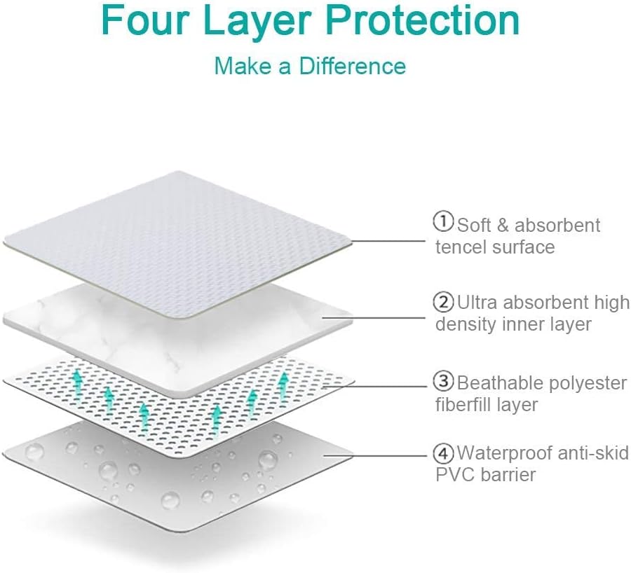 قدرة إضافية على الامتصاص وتنفس - ما يصل إلى 8 أكواب من الحماية تضمن بقاء سريرك جافًا تمامًا عند وقوع الحوادث. يتم امتصاص الرطوبة بسرعة في الوسادة وتوزيعها لحماية الملاءة والمرتبة من أي سائل أو سوائل جسدية وتجنب تجريد السرير في منتصف الليل.