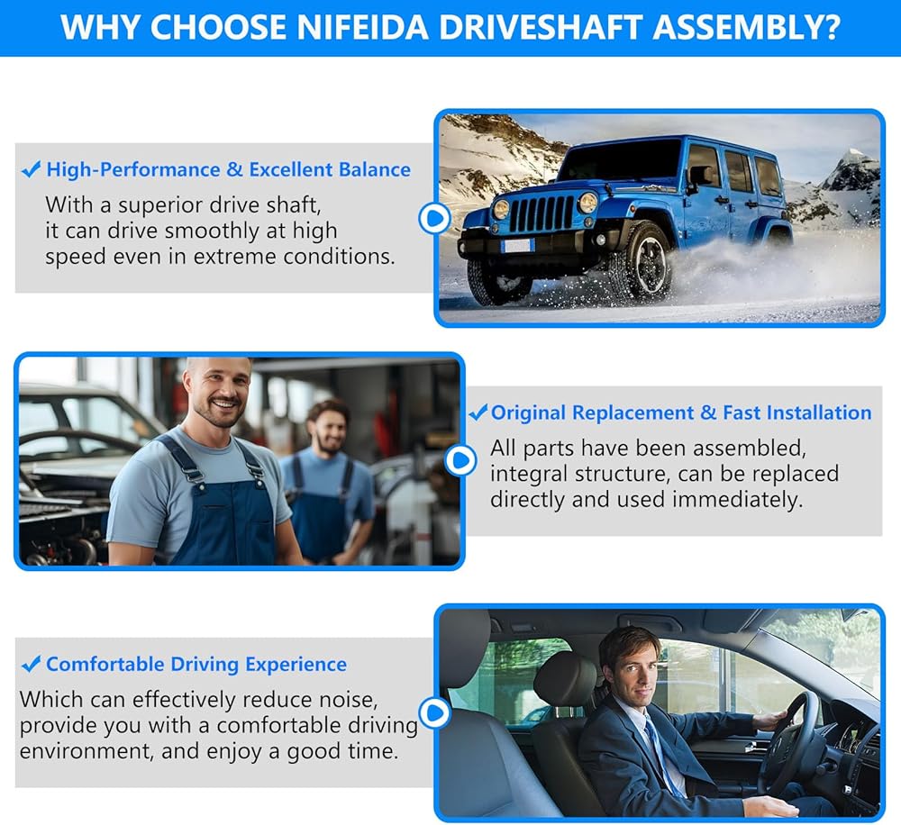 ✅تركيب متوازن مسبقًا وسهل: مجموعة عمود المحرك الخلفي الكامل من Nifeida متوازنة مسبقًا. يمكنك تركيبه مباشرة في سيارتك، وقد تم وضع شحم بدرجة حرارة عالية على الأربطة المنزلقة والمفاصل على شكل حرف U جاهزة للتركيب. (استغرق حوالي 30 دقيقة للاستبدال). يوصى بشدة بالتركيب الاحترافي أو مشاهدة مقاطع الفيديو ذات الصلة عبر الإنترنت قبل التثبيت.
