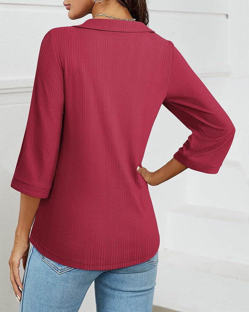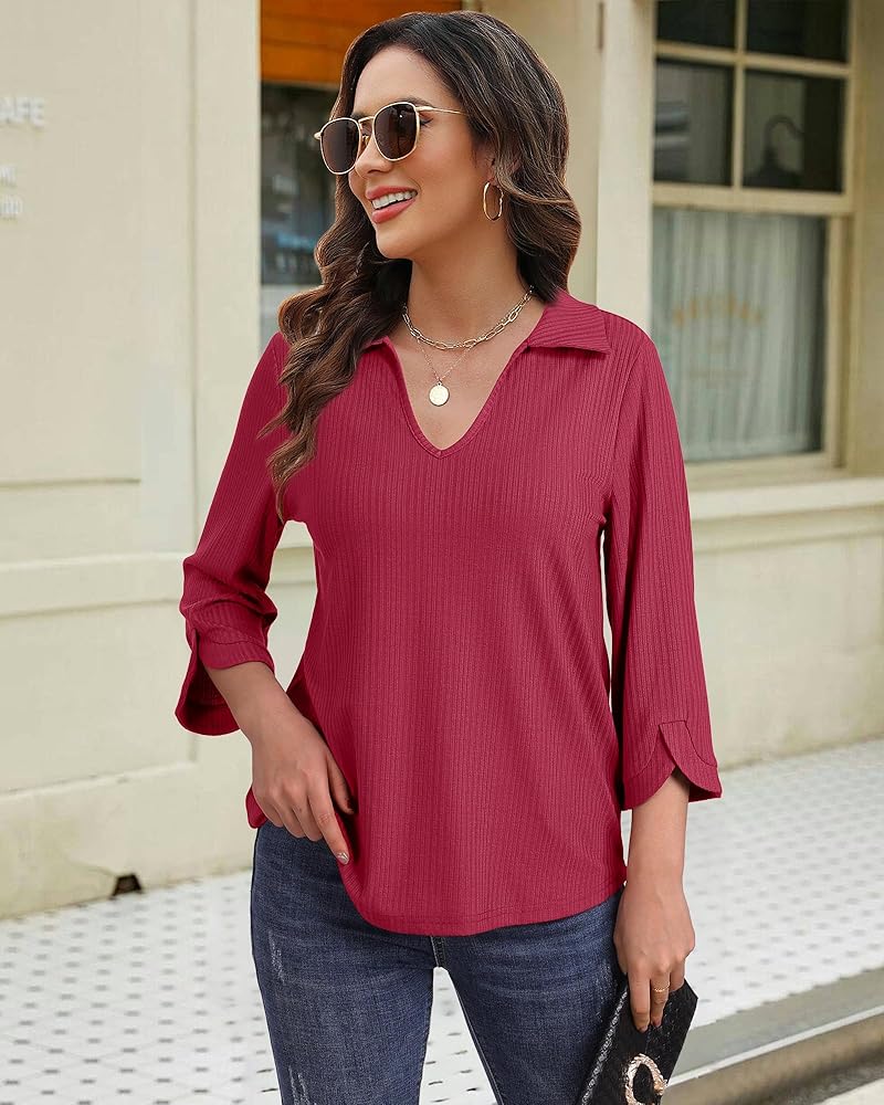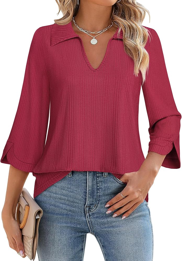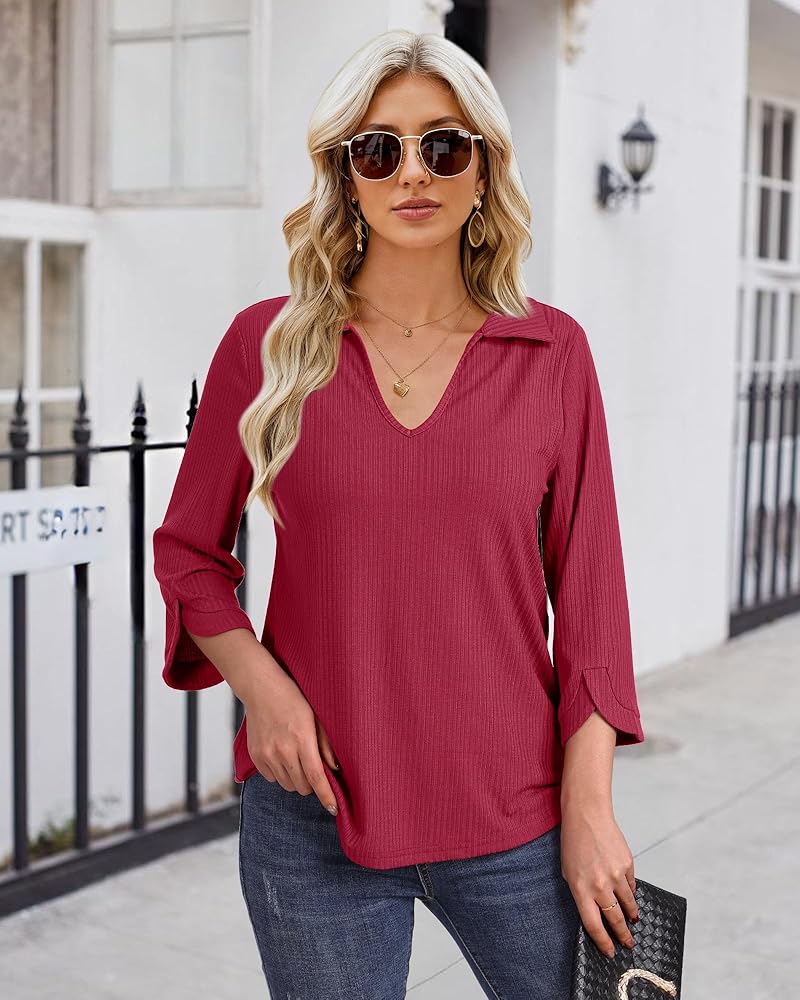الأكمام 3/4 جميلة. يبدو أكثر أناقة مع الياقة والرقبة على شكل حرف V وتنسدل الياقة بشكل صحيح. يمكن أن يكون كاجوال للغاية أو يمكنك ارتدائه قليلاً لحضور حدث جميل مع العائلة.