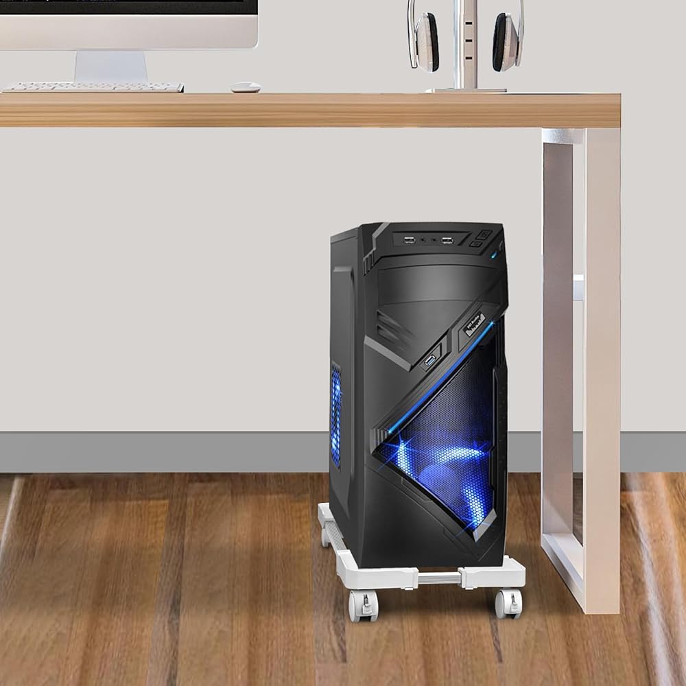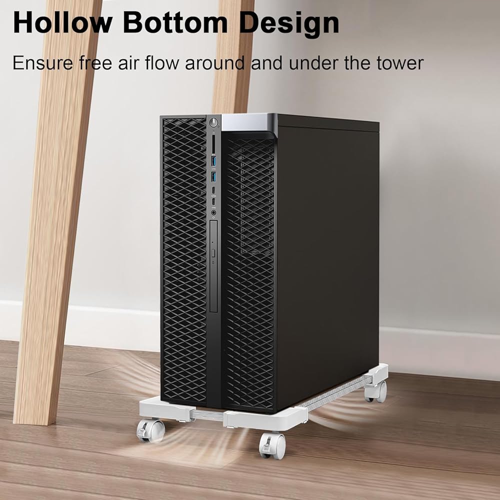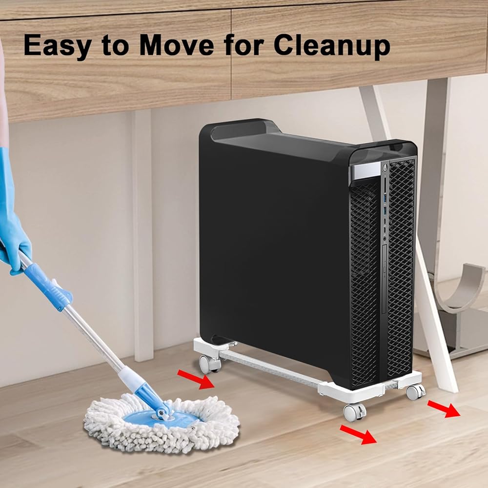 • FREE MOBILITY: With 4 Rolling Caster Wheels, the CPU Stand can be moved freely in all directions. Two of the wheels are lockable, and it is recommended that they be installed on the same side of the front to make it easier to keep them in place. It is easy to clean under the PC stand just a gentle push!