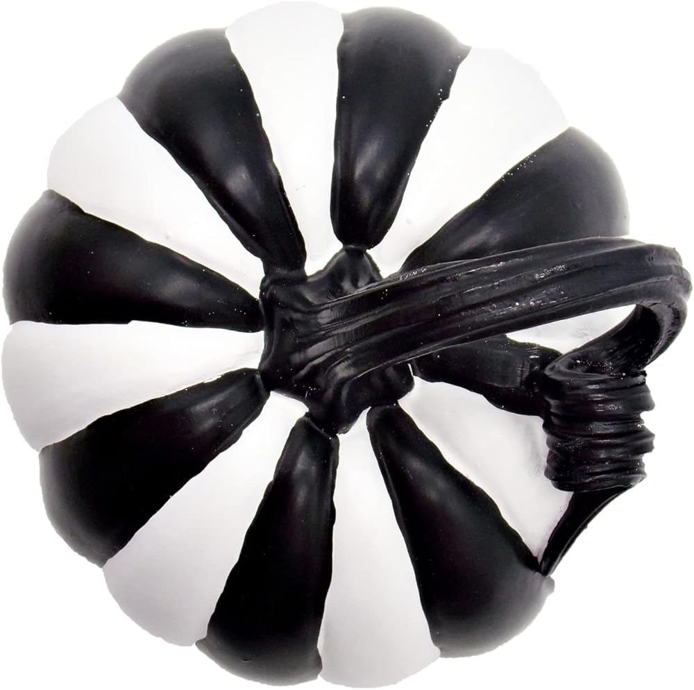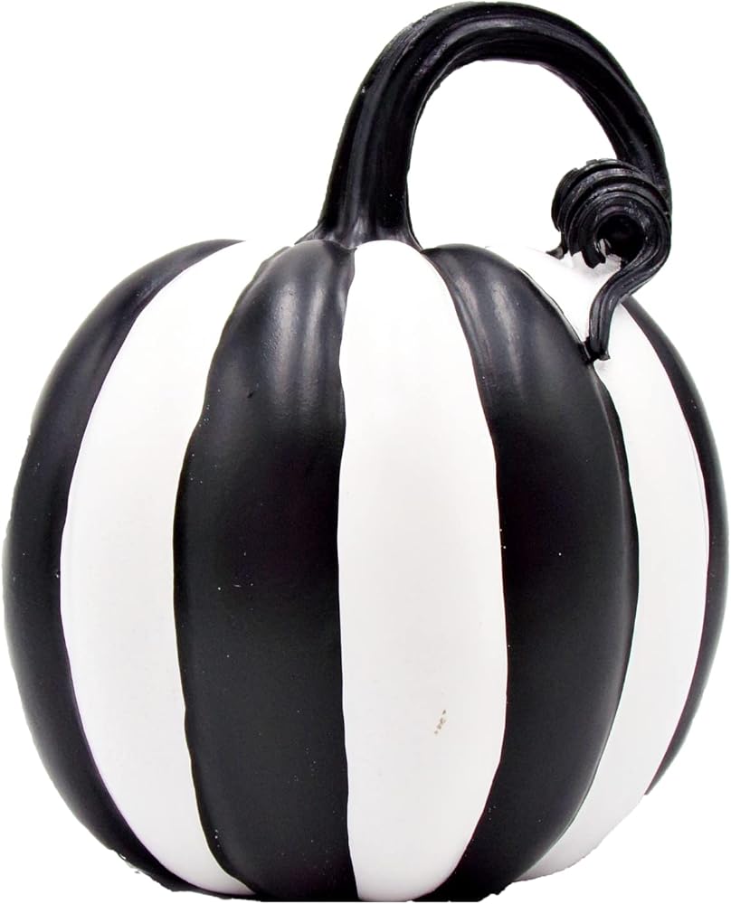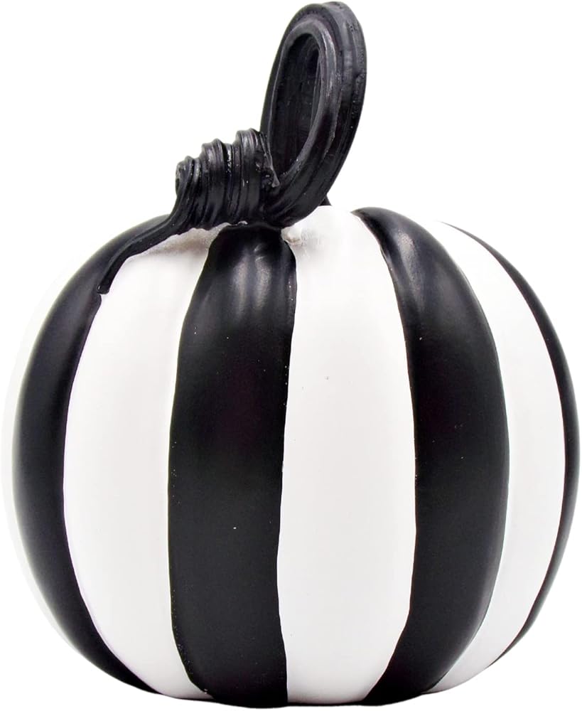Elevate your Halloween decor with this set of 2 black and white striped pumpkin decorations, infusing timeless charm into your seasonal setup. Measuring 6 inches each, these pumpkins are versatile accents suitable for your home, office, or party space, effortlessly creating a festive atmosphere. The monochrome black and white striped design complements diverse decor styles, while their high-quality resin construction ensures lasting allure. These durable pumpkins are easy to arrange on tabletops, mantels, and shelves due to their lightweight build, simplifying your Halloween decorating process.