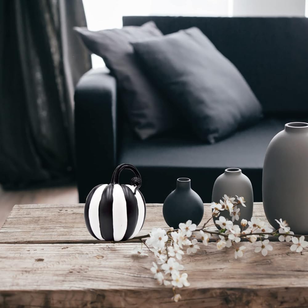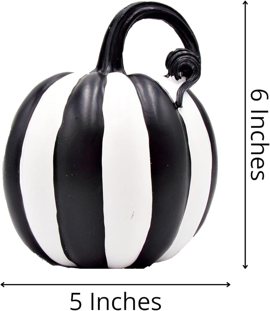 CLASSIC HALLOWEEN ELEGANCE: Elevate your Halloween decor with this set of 2 black and white striped pumpkin decorations, adding a touch of timeless charm to your seasonal setup.