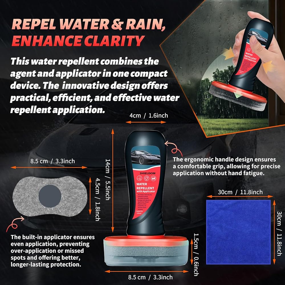 عامل مضاد للماء لمنع المطر في السيارة مع أداة توزيع لطلاء السيارات والزجاج والزجاج الأمامي والنوافذ والمرايا والأسطح الملساء | المركبات والشاحنات والمركبات الترفيهية وسيارات الدفع الرباعي والمنزل 100ml/3.4oz
