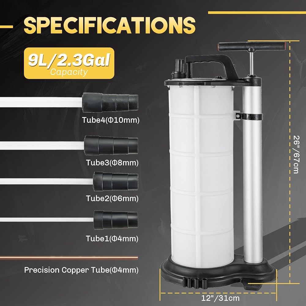 مضخة يدوية لتغيير الزيت بسعة 9 لتر مع 4 خراطيم، مضخة تغيير مستخرج الزيت لإخلاء سوائل السيارات، مستخرج سوائل تغيير الزيت مع عصا قياس الأسلاك وخراطيم الشفط