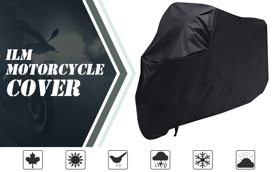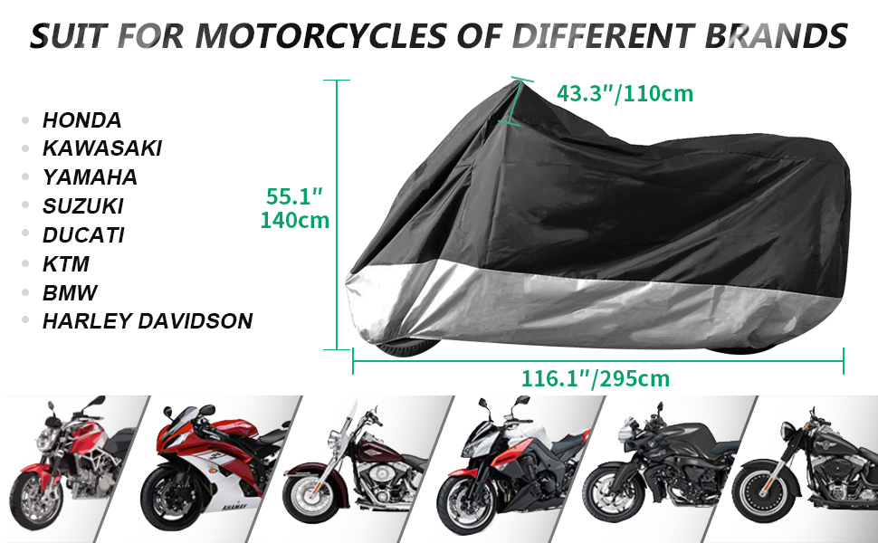 ملاءمة عالمية - يناسب غطاء الدراجة النارية هذا معظم الدراجات النارية التي يصل طولها إلى 108 بوصات، بما في ذلك العلامات التجارية المشهورة مثل Harley Davidson وHonda وSuzuki وKawasaki وYamaha وDucati وKTM وBMW وغيرها الكثير. حجم الغطاء هو 116.1 × 43.3 × 55.1 بوصة. يرجى التأكد من أن طول الغطاء أطول بحوالي 7.88 بوصة من الطول الفعلي للدراجة، بحيث يناسب الغطاء دراجاتك النارية القياسية والدراجات النارية على الطرق الوعرة.