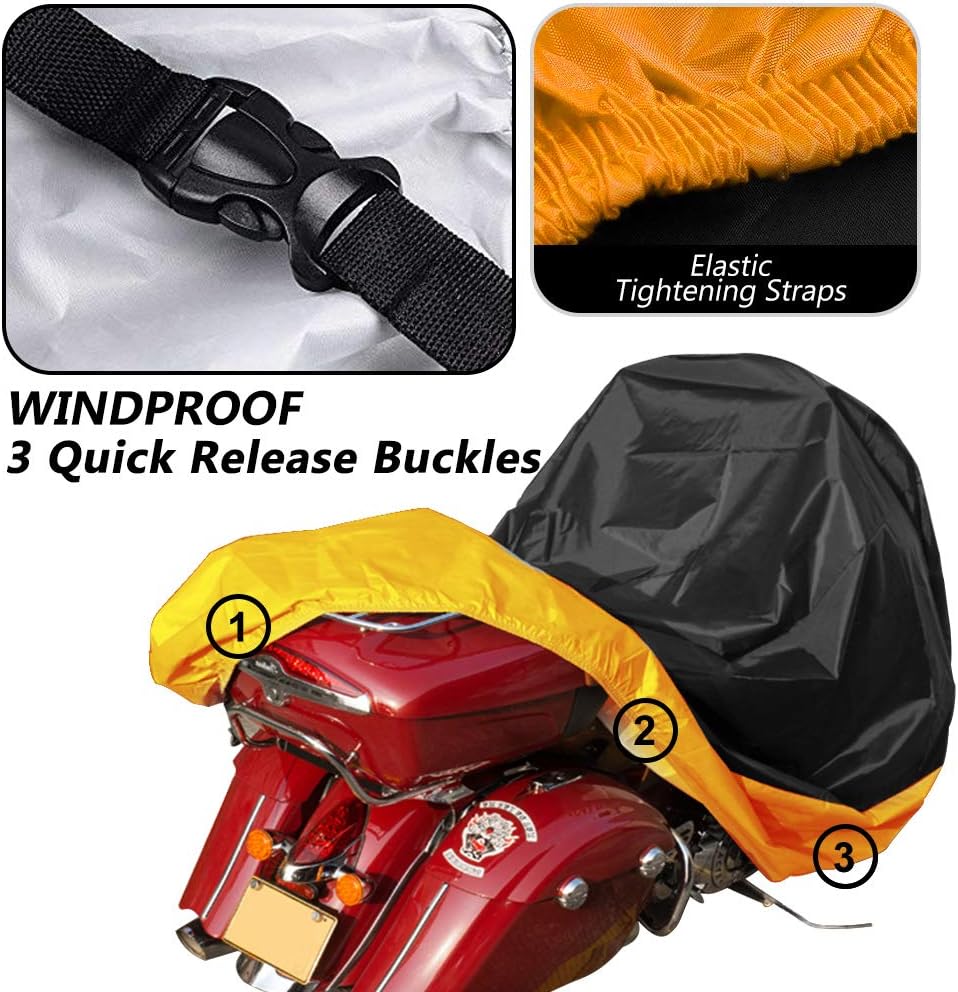3 أبازيم مقاومة للرياح - تم تصميم غطاء الدراجة النارية بثلاثة أبازيم للحفاظ على سيارتك مغطاة بإحكام في الأيام العاصفة. واحدة للعجلة الأمامية، وواحدة للعجلة الخلفية، وواحدة للعجلة الوسطى. ما عليك سوى فك الغطاء ووضعه على دراجتك.