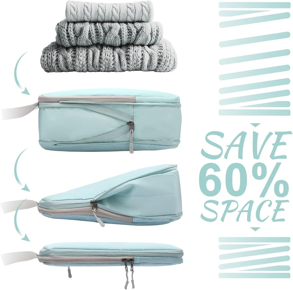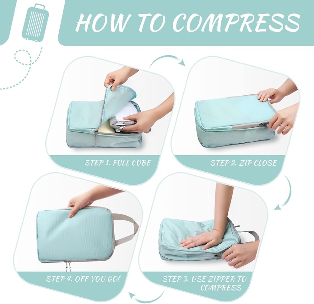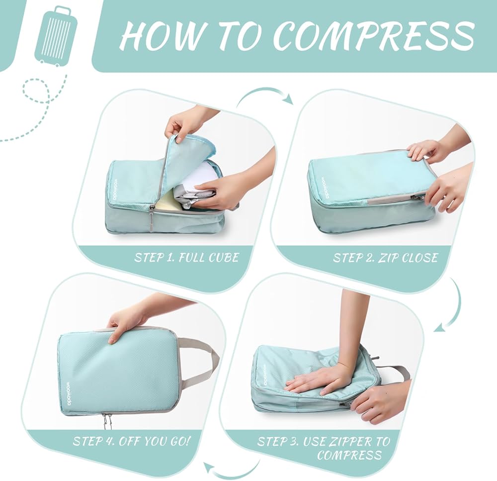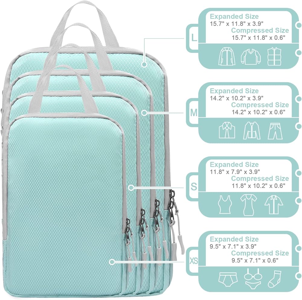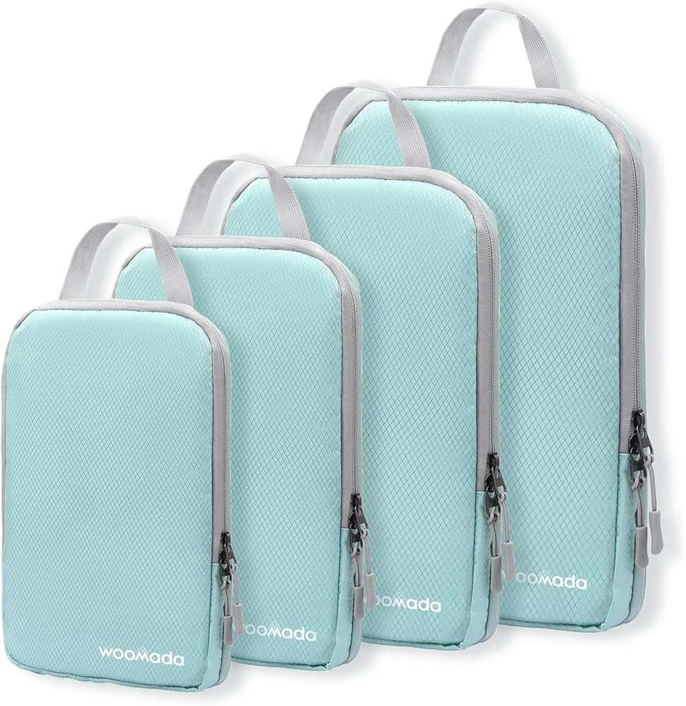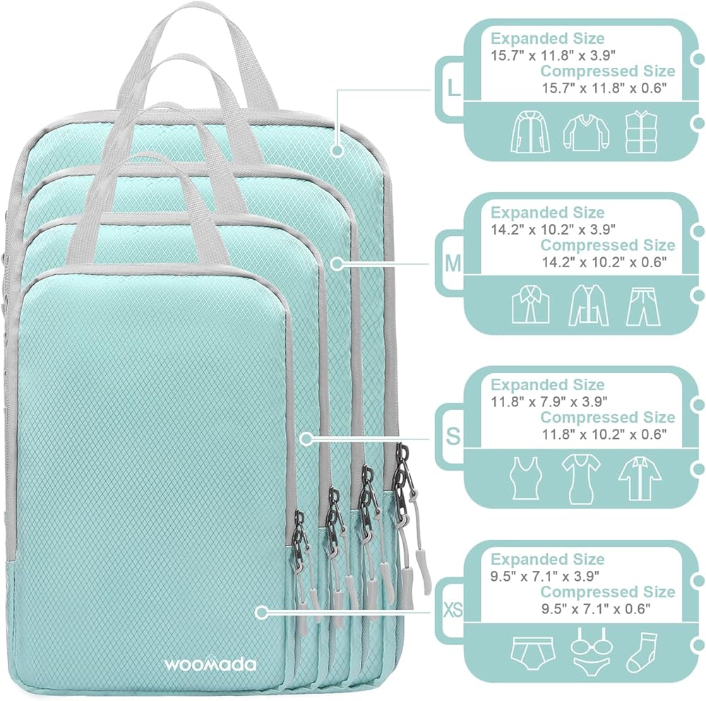مكعبات التعبئة المضغوطة من WOOMADA لحقائب السفر وأساسيات السفر 4 مجموعات منظم حقائب السفر القابلة للتوسيع للأمتعة (فيروزي)
