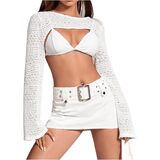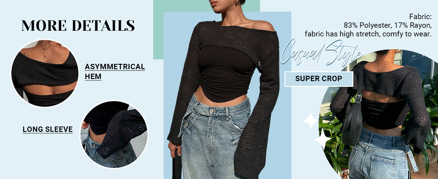 • المزايا: كم طويل، مجوف للخارج، كروشيه، حاشية غير متماثلة، نسيج مضلع، طول قصير، Y2K، نمط عصري وملابس الشارع.