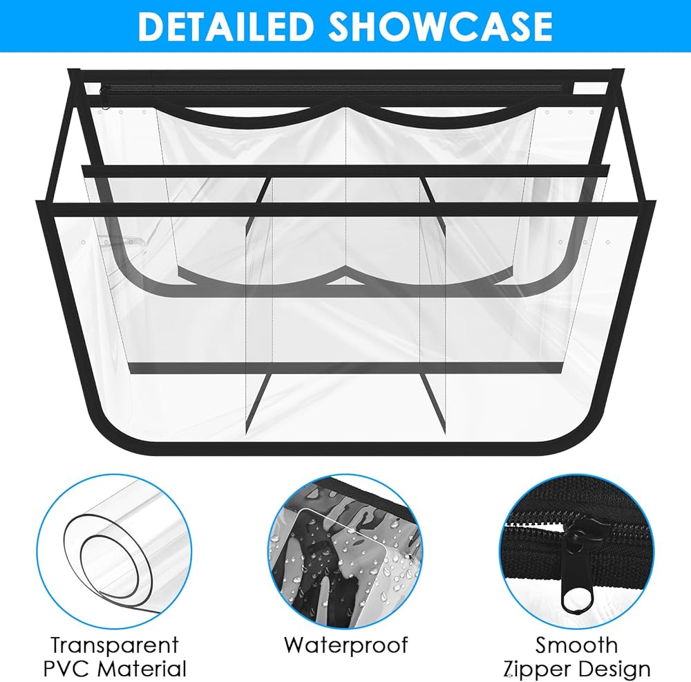 • خامة عالية الجودة: مصنوعة من مادة PVC عالية الجودة، ومتينة، وسهلة التنظيف، وقد تم تصميم منظمنا ليتحمل البلى والتمزق اليومي. بينما تسمح لك المادة الشفافة برؤية ما بالداخل بسهولة