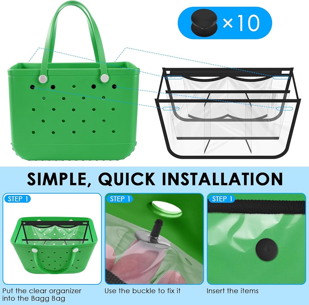 • تركيب بسيط: فقط ضع منظم الحقيبة هذا في حقيبة الشاطئ، ثم يمكنك تثبيت 4 أزرار لتأمين منظم حقيبة الشاطئ وحقائب الشاطئ الخاصة بك. ويوجد 6 مشابك احتياطية في حالة فقدانها عن طريق الخطأ.