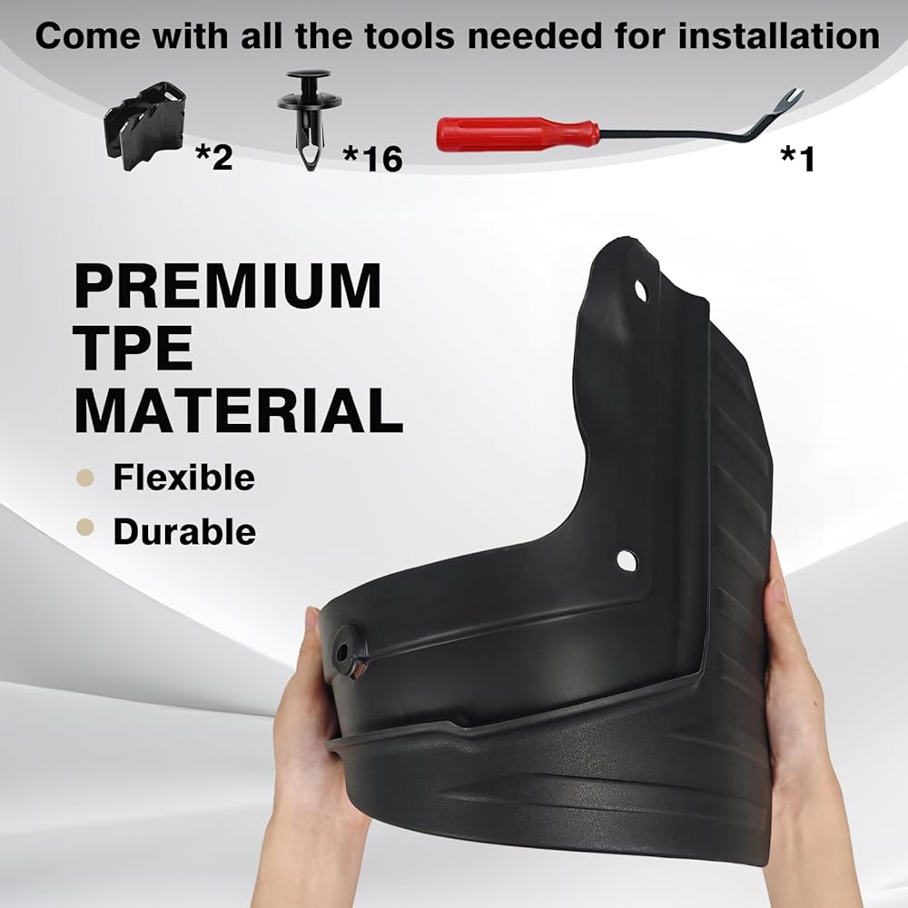 Easy to install: Please refer to the installation guide included in the package for easy installation, no drilling required. Utilize the original holes and the provided push pins as instructed for a secure and hassle-free installation of the mud flaps. Package includes front flaps*2, rear flaps*2, tools bag*1, instruction*1