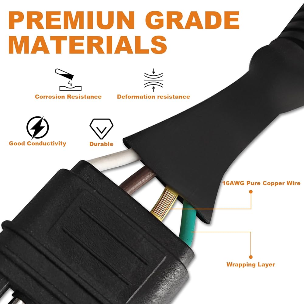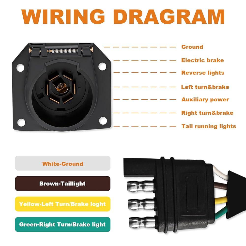 • 【موصل مقطورة RV ذو 7 اتجاهات】موصل مقطورة ذو 7 شفرات على طراز RV لجانب السيارة. يتصل 7 اتجاهات بأسلاك مركبة القطر ويوفر اتصالاً كاملاً بـ 7 اتجاهات لتشغيل المصابيح الخلفية للمقطورة، وأضواء الفرامل، وإشارات الانعطاف، والأضواء العكسية، وفرامل المقطورة الكهربائية، والطاقة المساعدة (سلك 12 فولت +)
