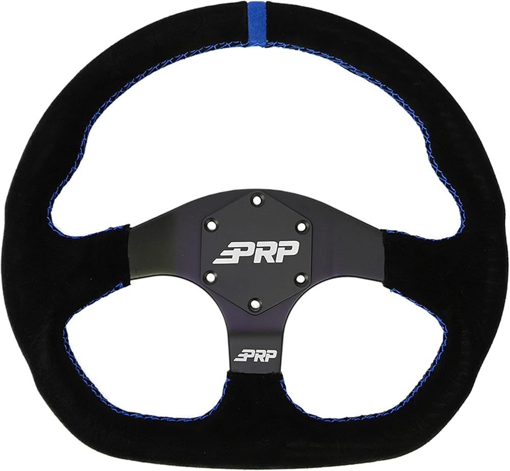 PRP's Steering Wheels are Built for Off-Road. These D-Shaped (or Flat Bottom) Steering Wheels are great for UTV's and other vehicles that don't have a lot of space between the wheel and your legs. Each is made with high quality suede that is durable, moisture resistant, and wont rub off on your hands. The wheel has a thick hand grip that makes it easy control while steering though corners or bouncing around in the rocks. Constructed from high strength aluminum, with a matte black finish for extra durability... and to make it look cool. The steering wheel has 6 point bolt pattern, specifically chosen because it fits the majority of aftermarket quick releases and hubs. Available in three different colors. Features: Made from high strength aluminum with a matte black finish. 6 Point Bolt Pattern - Most common in off-road industry quick release adapters. Durable and moisture resistant High-Quality Suede that won't rub off on your hands. Measurements: Diameter – 13 inches Weight – 2 lbs Dish depth – 1½ inches Bolt Pattern Measurement - 2.75"