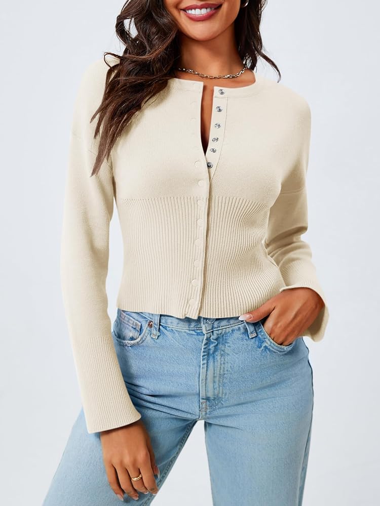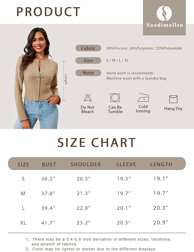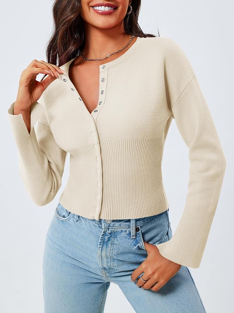Saodimallsu سترات نسائية مقصوصة بأزرار سفلية وأكمام طويلة ورقبة على شكل حرف V ومضلعة ومتماسكة ومقاس نحيف بلوفر علوي قصير