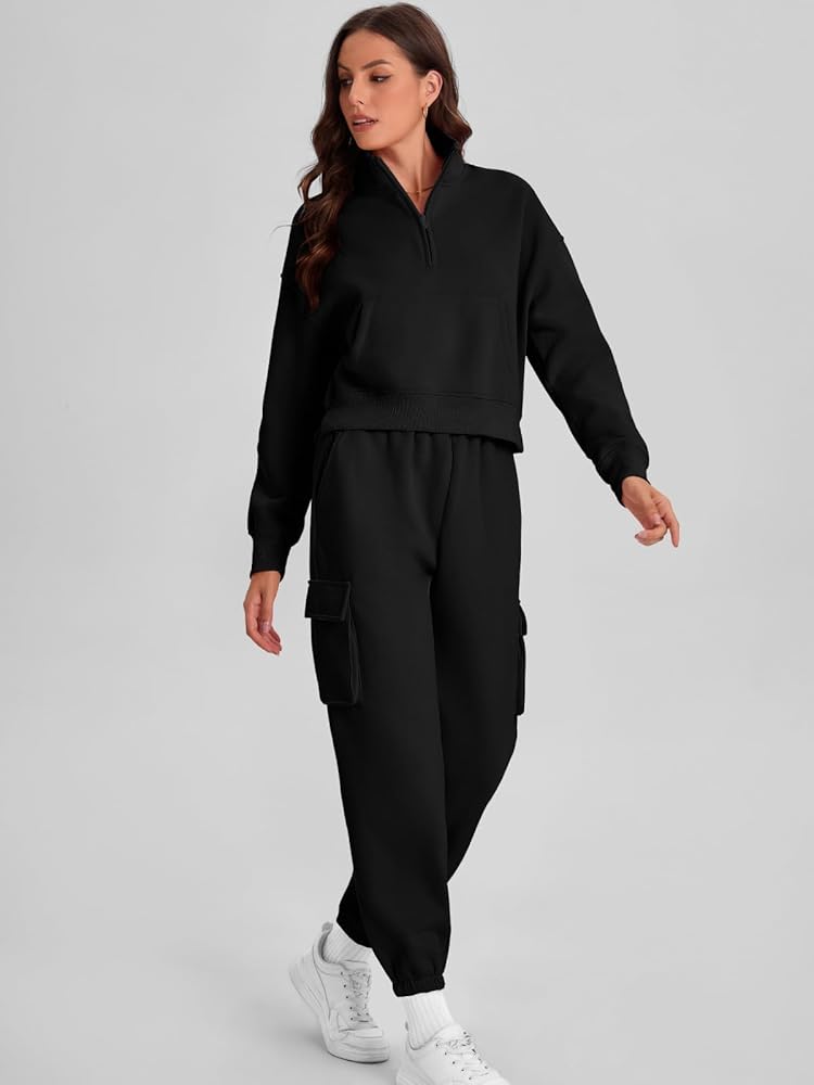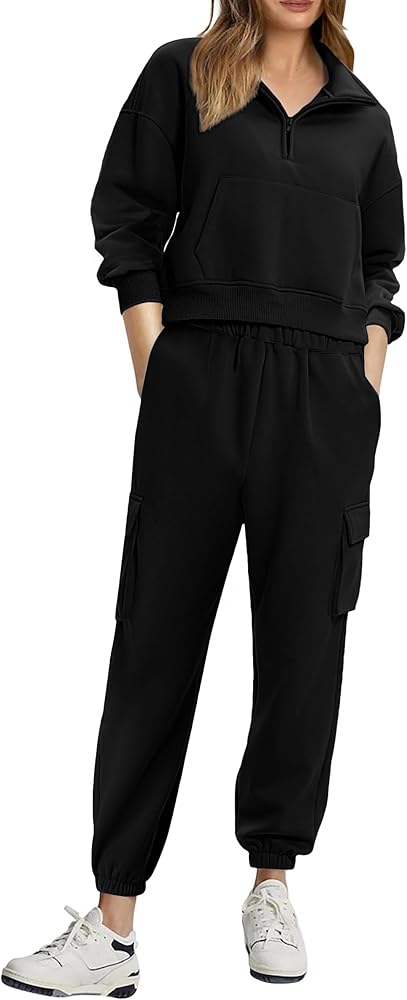 الميزة - طقم مكون من قطعتين للنساء مع سترات قصيرة بنصف سحاب وبنطلون الركض كارجو، وجيوب، وسراويل رياضية مرنة عالية الخصر، عصرية وخاصة في ملابس الخريف